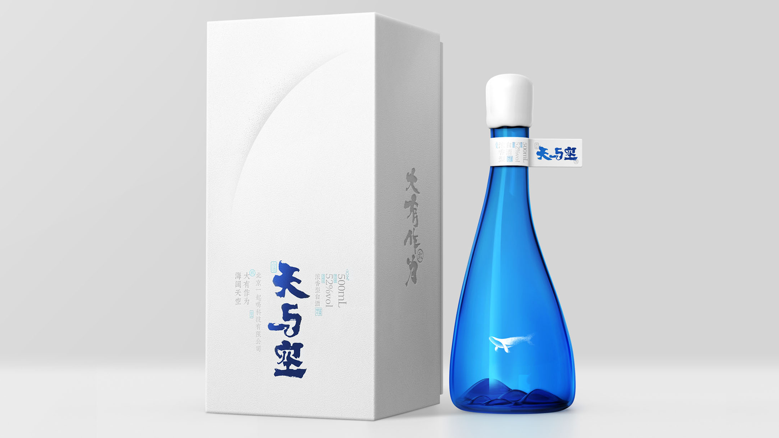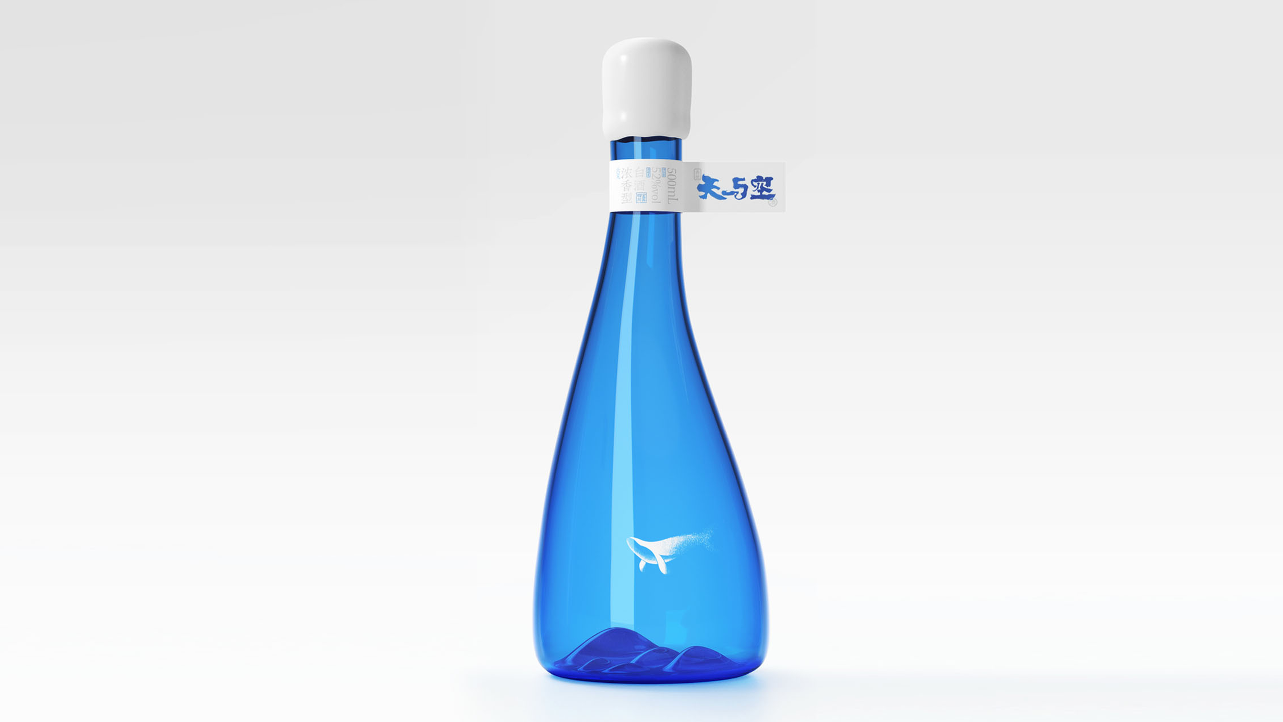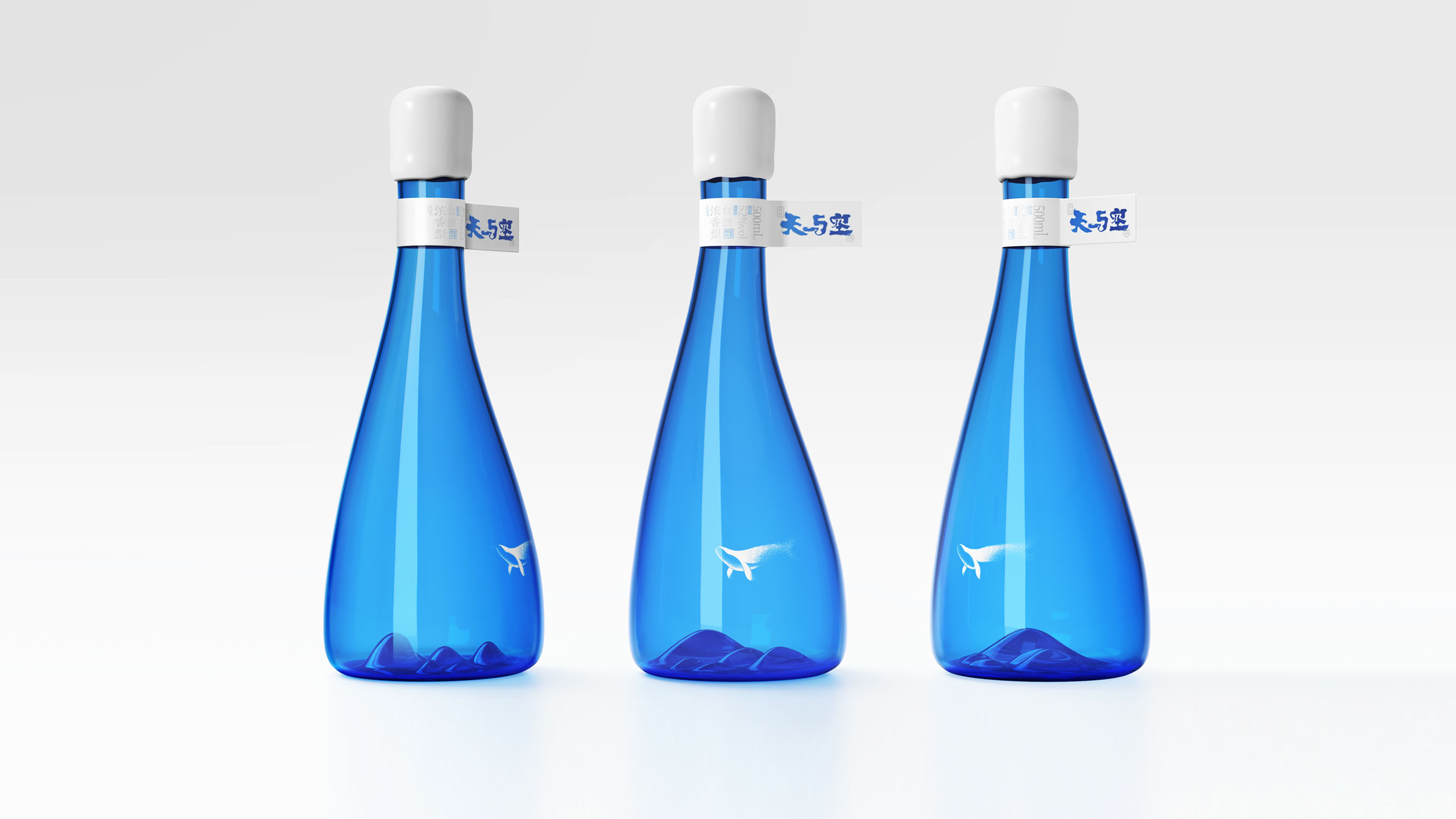 为了更好的打造好产品的独有气质,我们将容器设计成非对称的流线型形态,将瓶子的底部内凹造型做成了连绵起伏的山峦,配合瓶身上的“鲸鱼”图案的透明标签,展现了一种鱼在空中遨游的场景,以此来诠释我们对“天与空”品牌精神内核的理解。