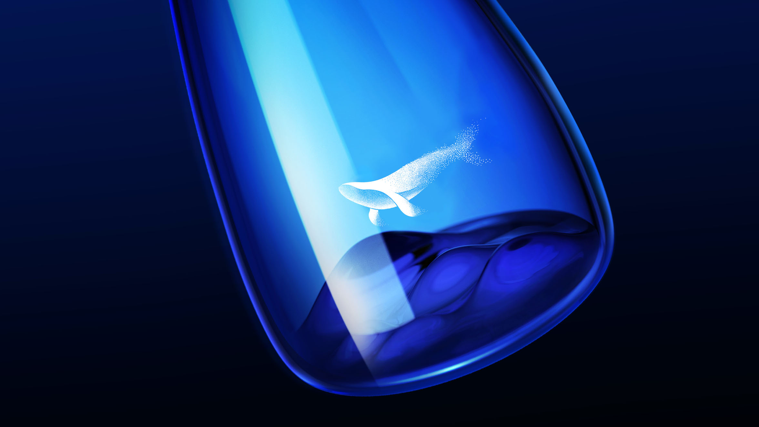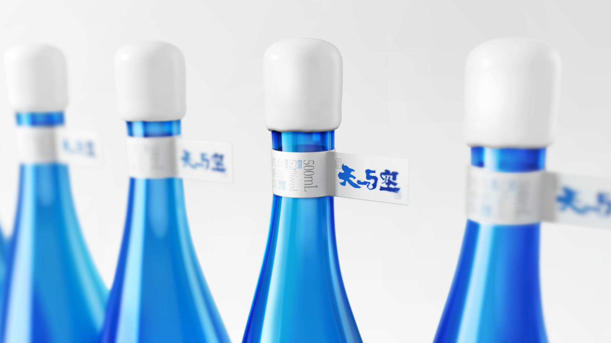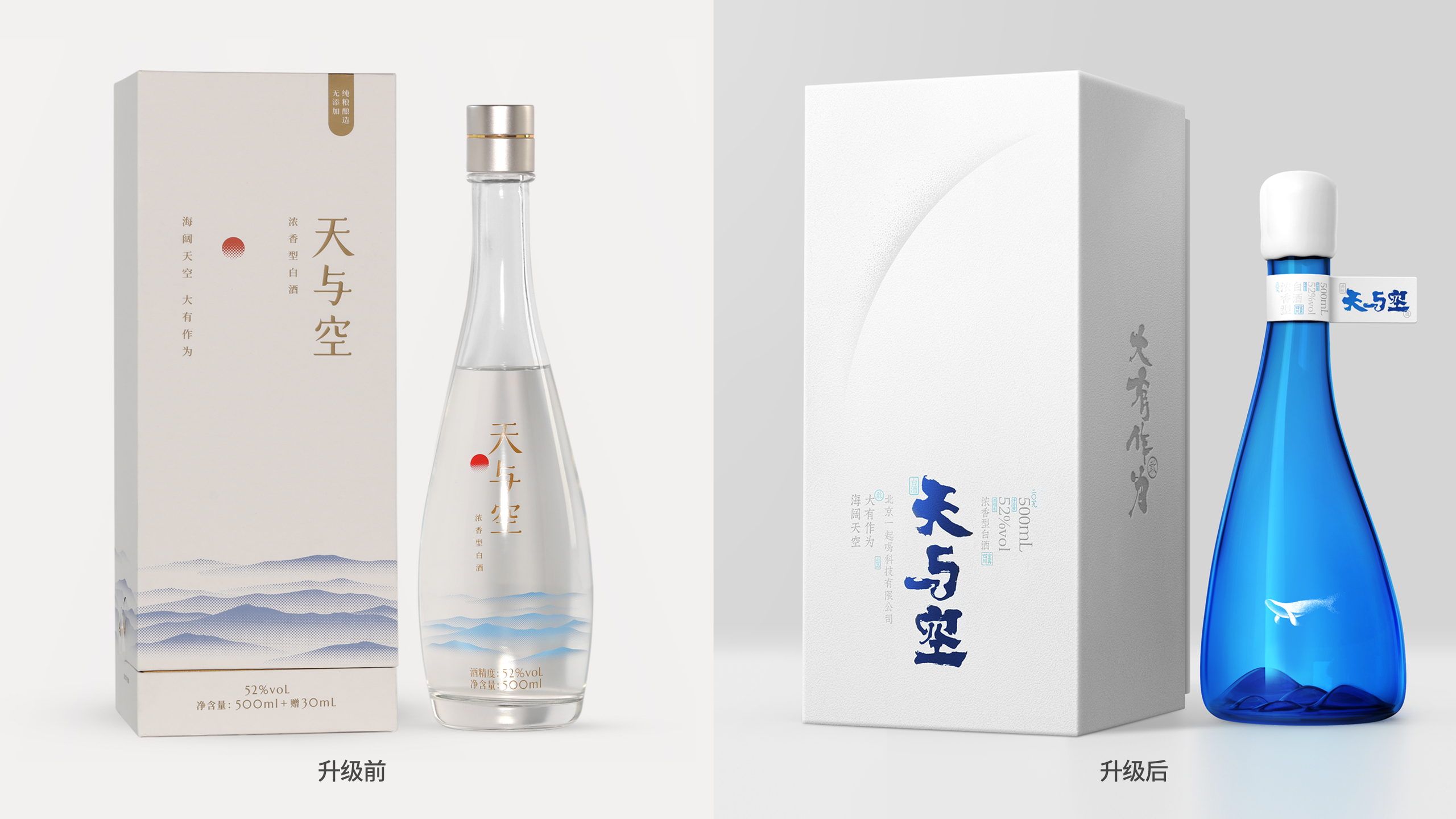 为了更好的打造好产品的独有气质,我们将容器设计成非对称的流线型形态,将瓶子的底部内凹造型做成了连绵起伏的山峦,配合瓶身上的“鲸鱼”图案的透明标签,展现了一种鱼在空中遨游的场景,以此来诠释我们对“天与空”品牌精神内核的理解。