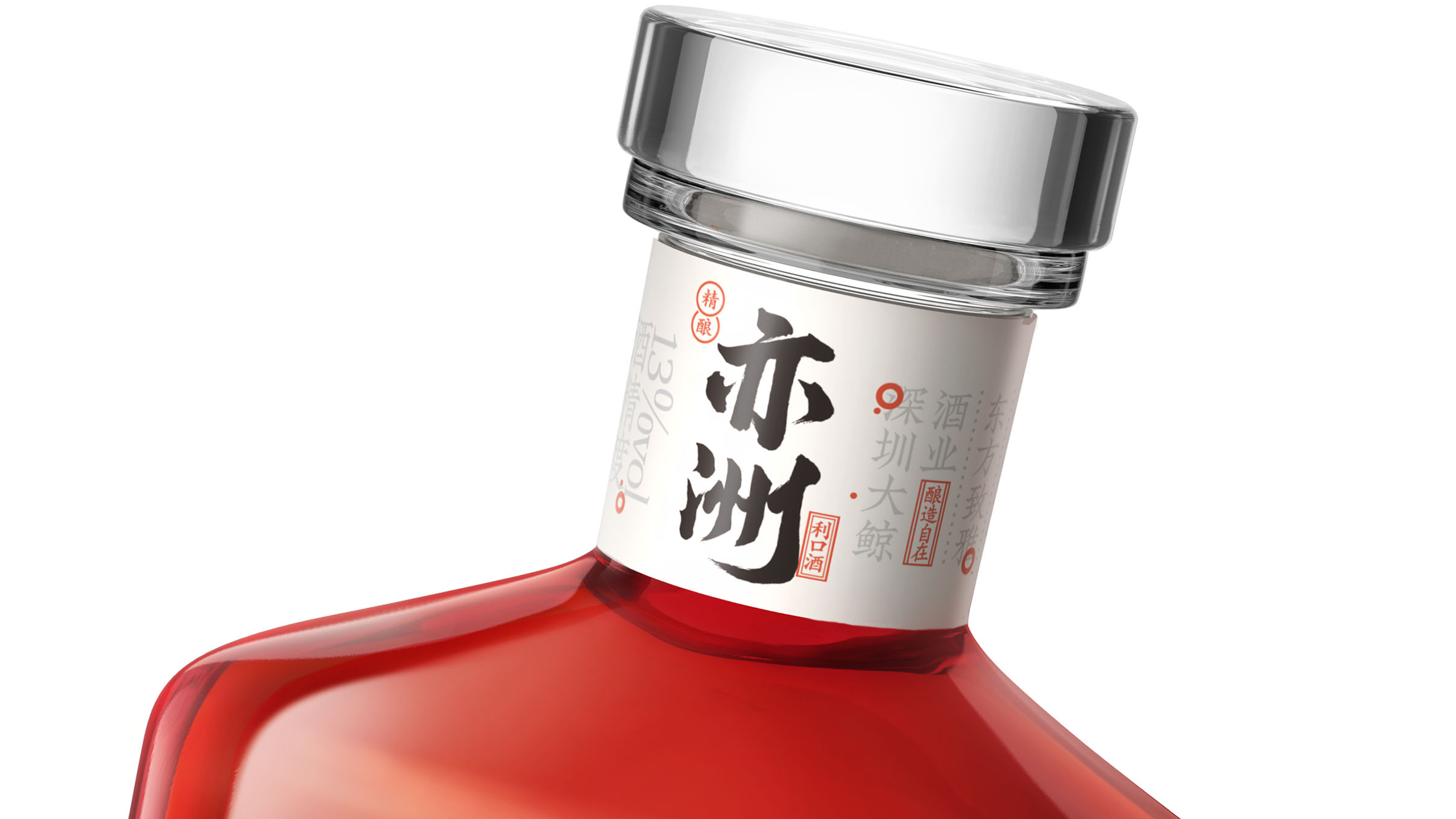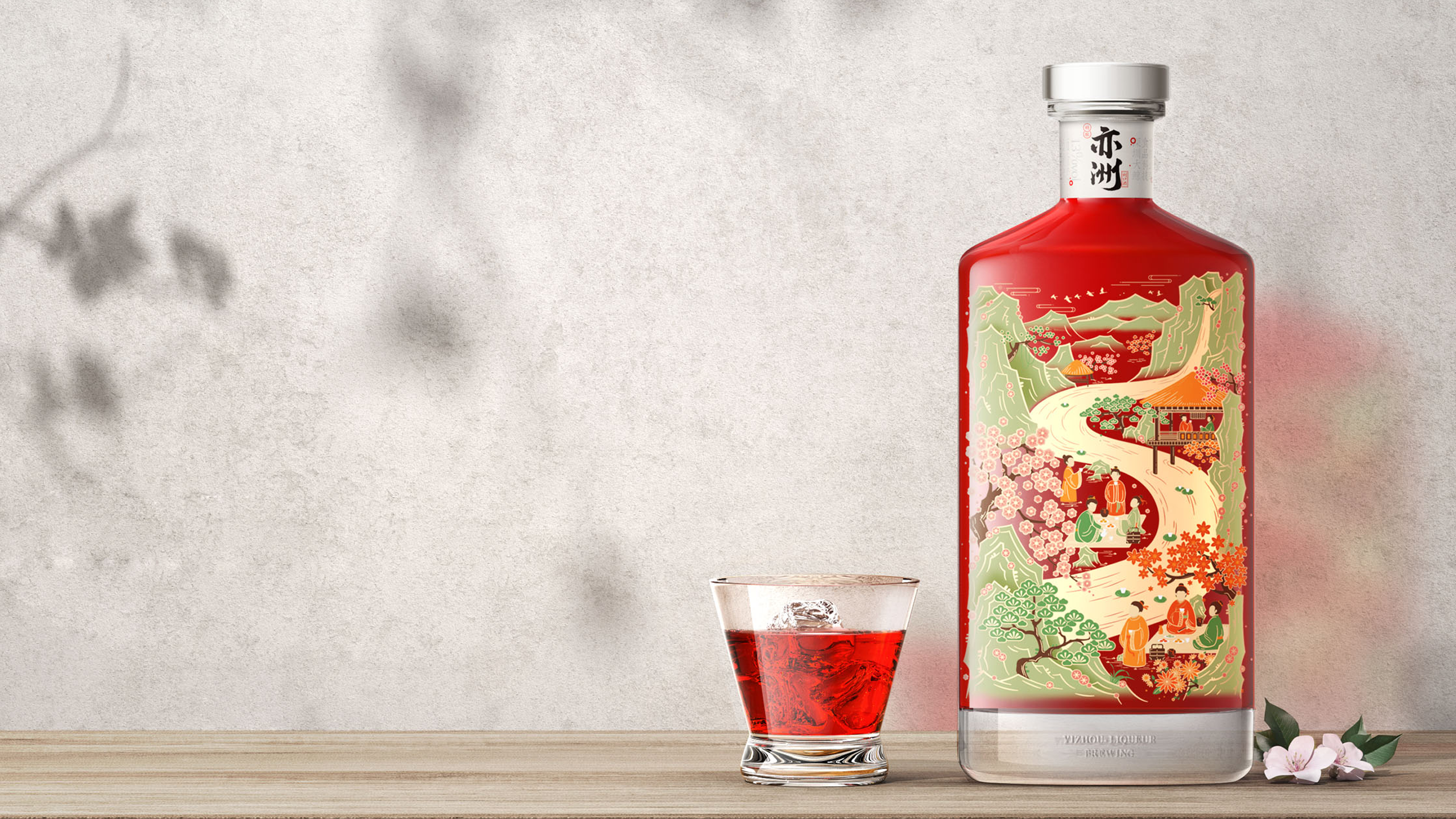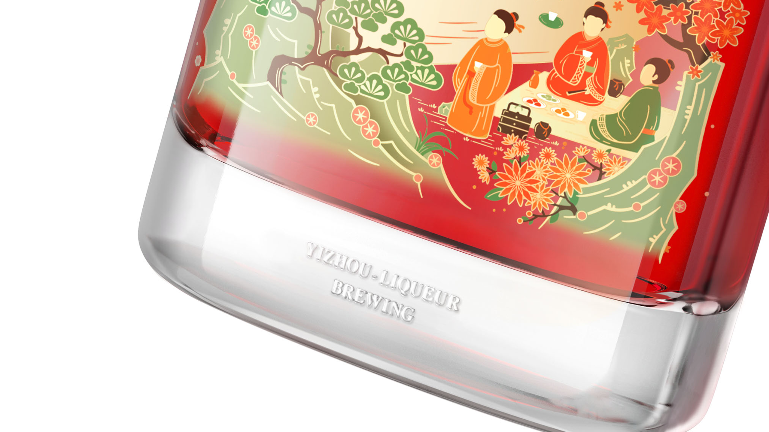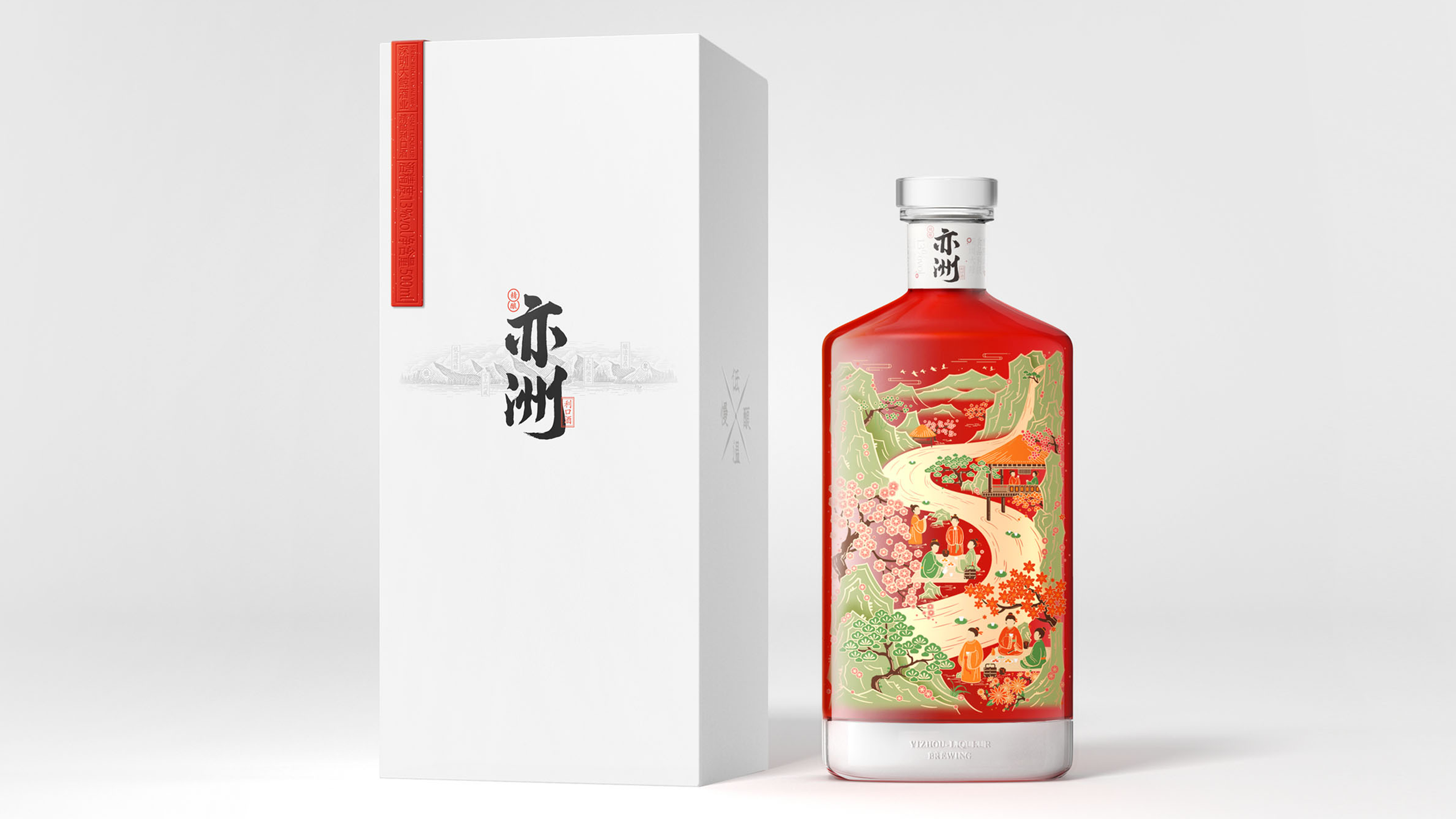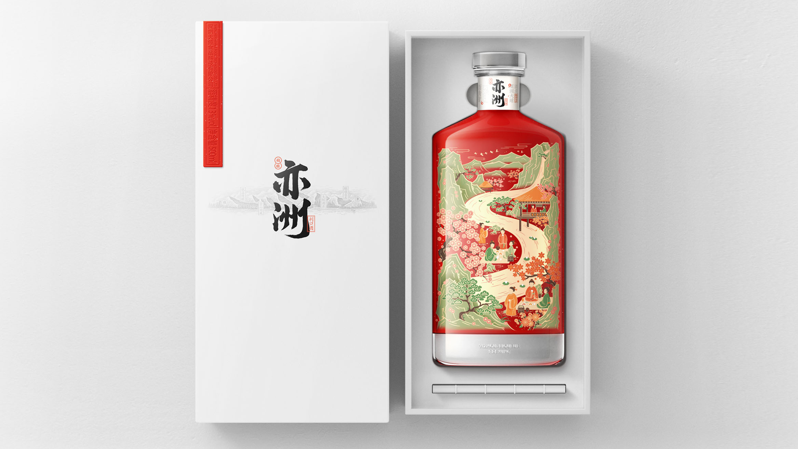 其中“亦洲·雅”的主要原料为“猕猴桃”,其酒体呈现金黄色,我们采用一体开模的方式,将聚饮的场景雕刻在了容器的背面,容器本身是透明玻璃瓶,当金黄的酒体灌满酒瓶后,视觉效果更是美不胜收。“亦洲·风”的主要原料为“桃花”,所以酒体的色泽呈现迷人的“桃红色”。我们在容器的正面,采用精致的图形插画将中国古代“曲水流觞”的典故演绎出来,背面则是在模拟水流一样的非规则造型中凸起了“亦州”二字,其作用除了美观之外,也会让手感更加丰富。