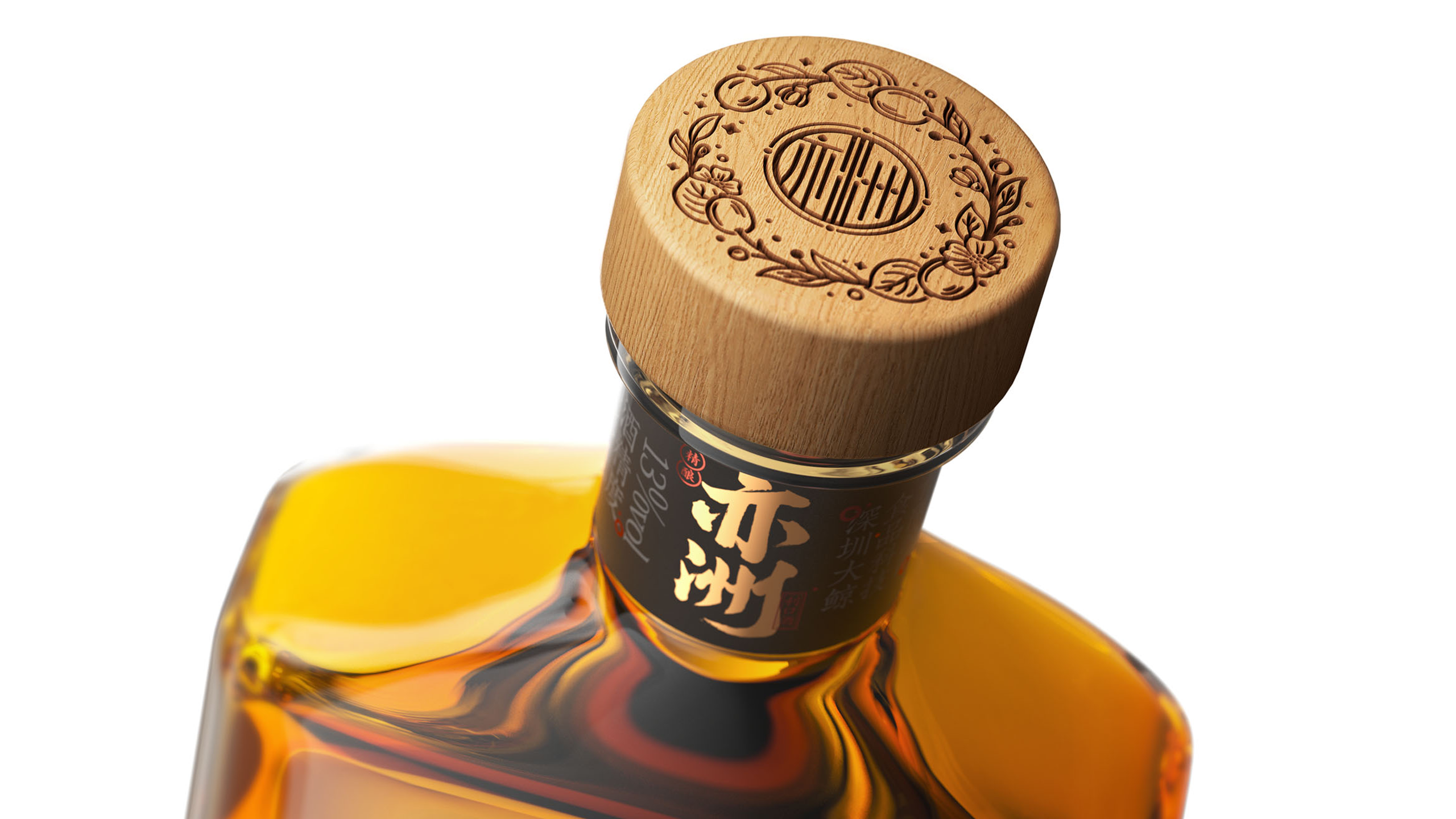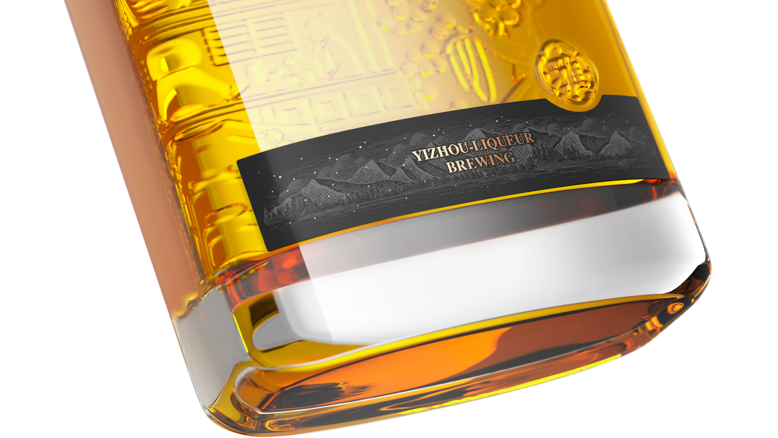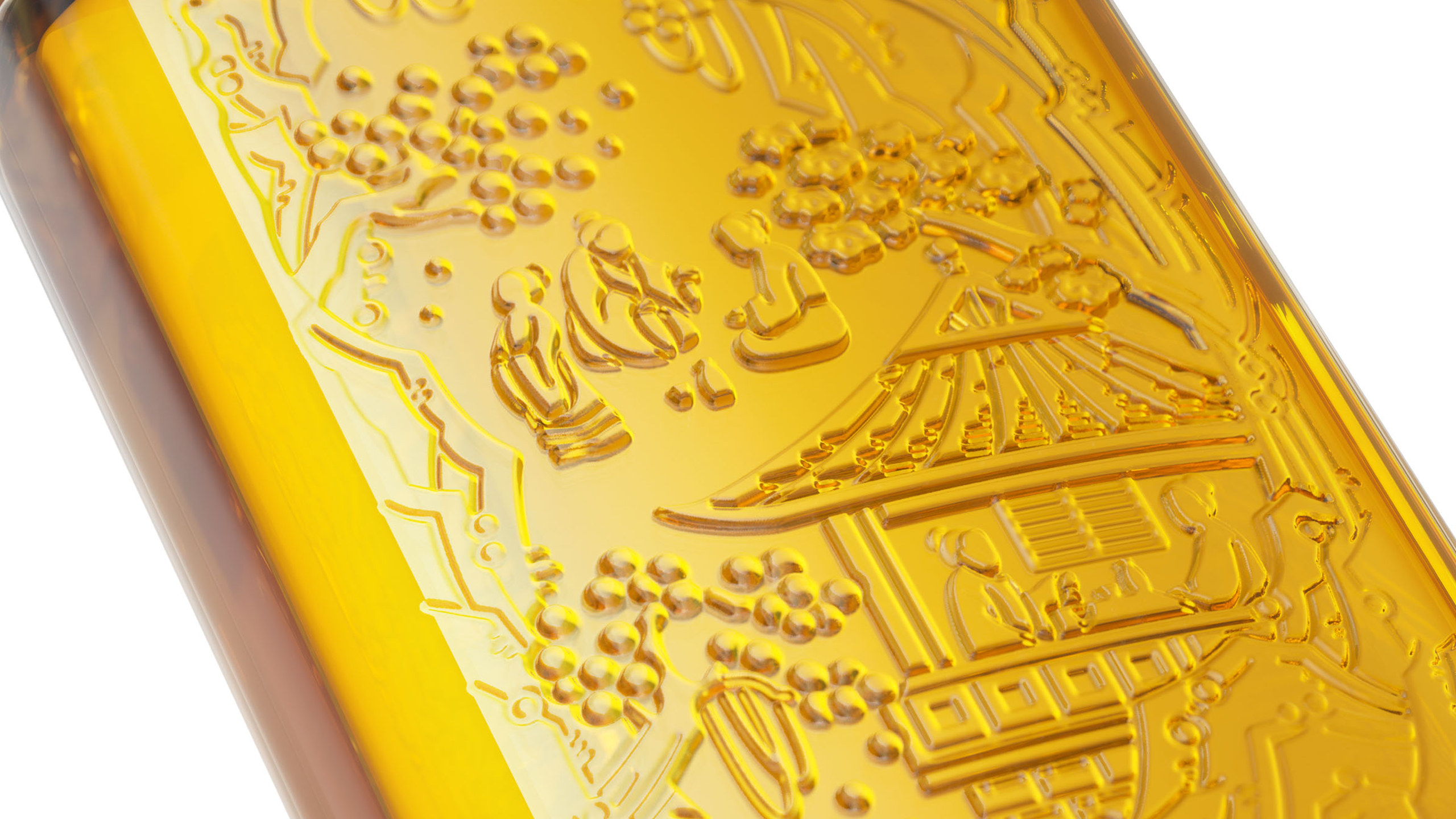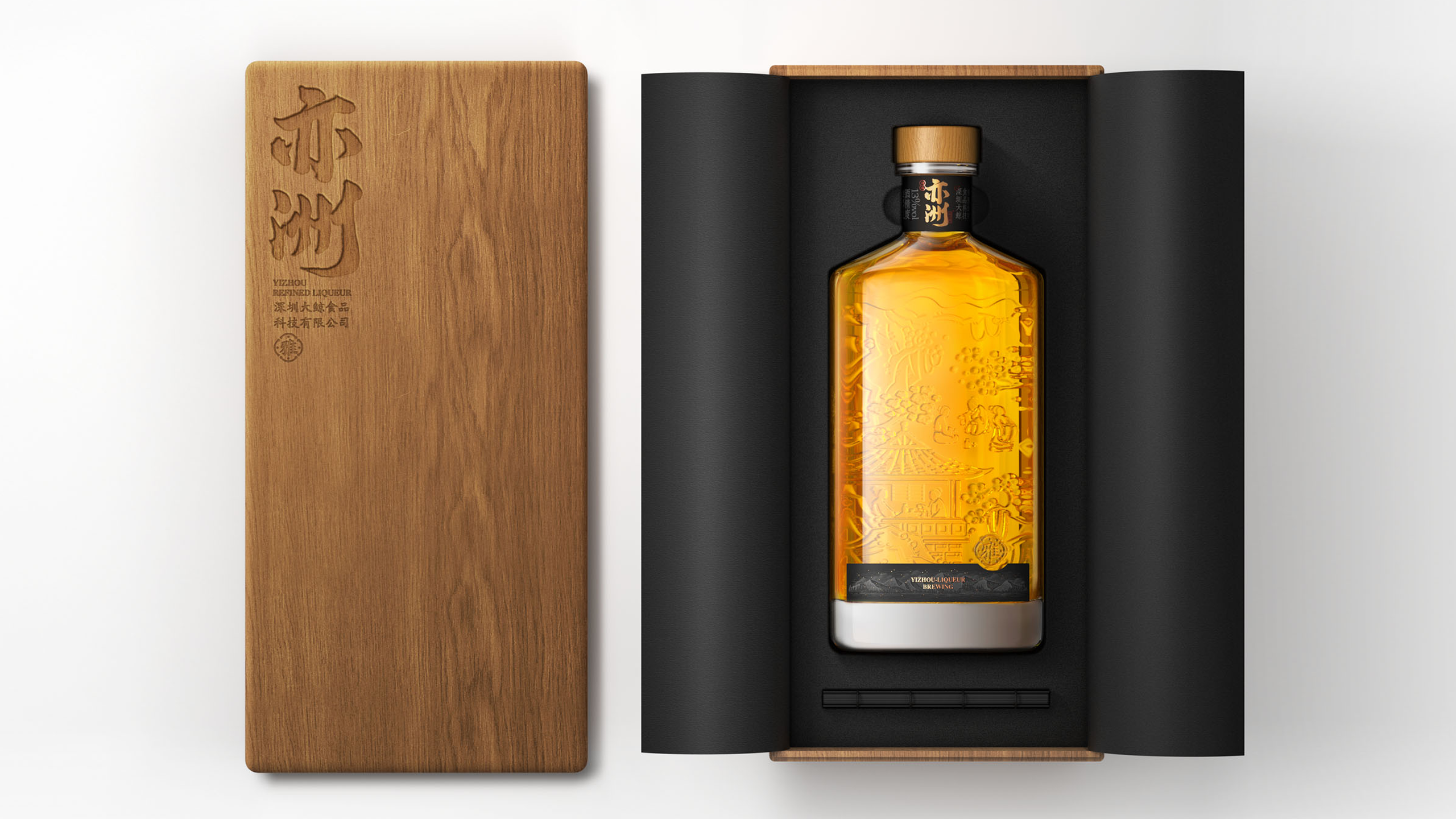 其中“亦洲·雅”的主要原料为“猕猴桃”,其酒体呈现金黄色,我们采用一体开模的方式,将聚饮的场景雕刻在了容器的背面,容器本身是透明玻璃瓶,当金黄的酒体灌满酒瓶后,视觉效果更是美不胜收。“亦洲·风”的主要原料为“桃花”,所以酒体的色泽呈现迷人的“桃红色”。我们在容器的正面,采用精致的图形插画将中国古代“曲水流觞”的典故演绎出来,背面则是在模拟水流一样的非规则造型中凸起了“亦州”二字,其作用除了美观之外,也会让手感更加丰富。