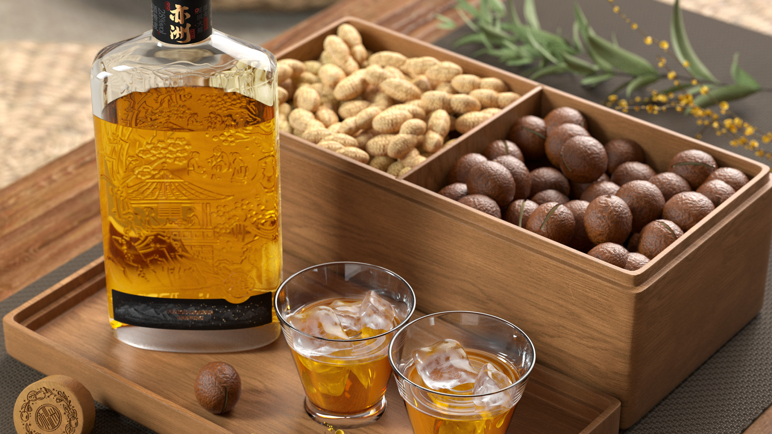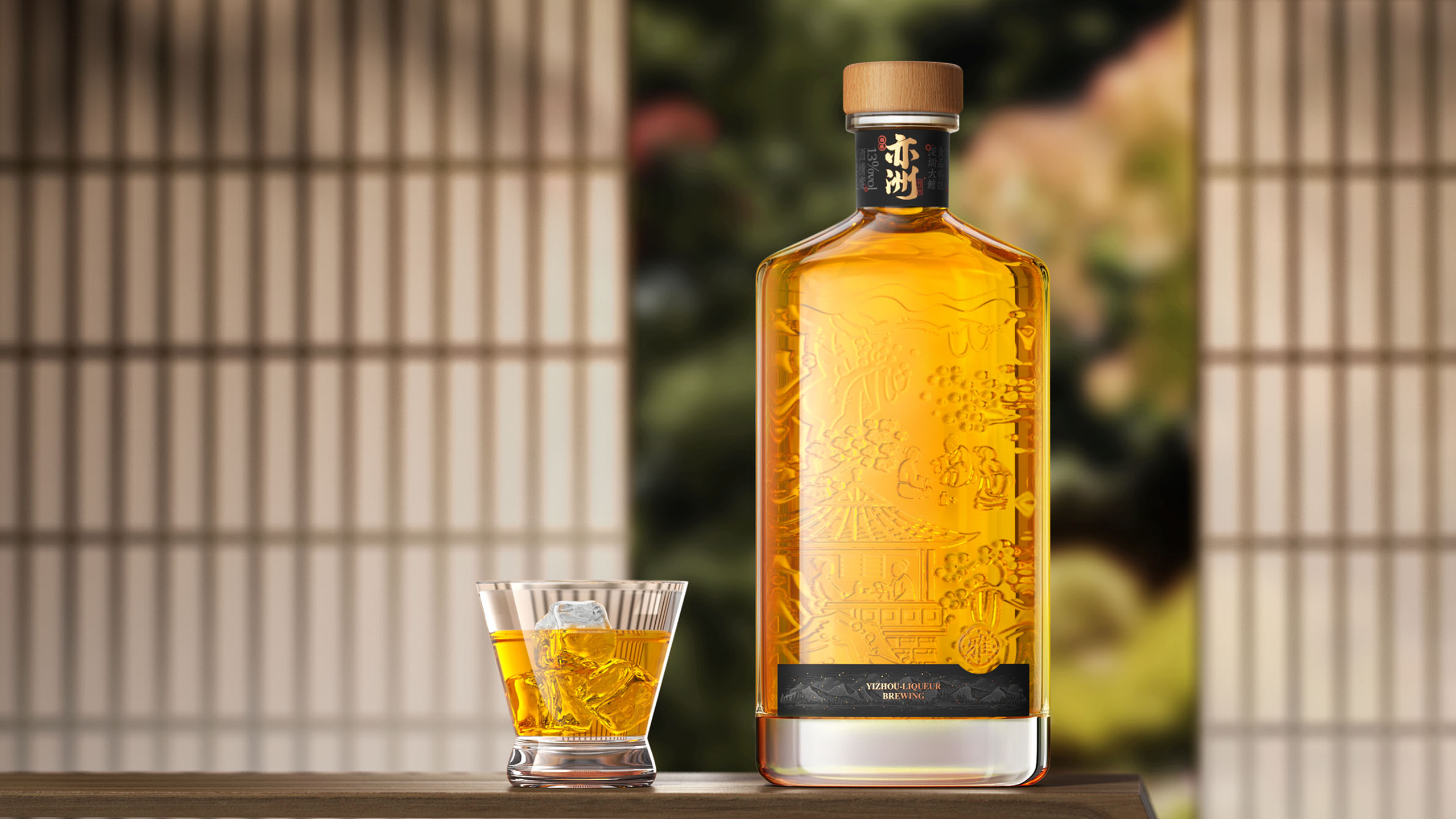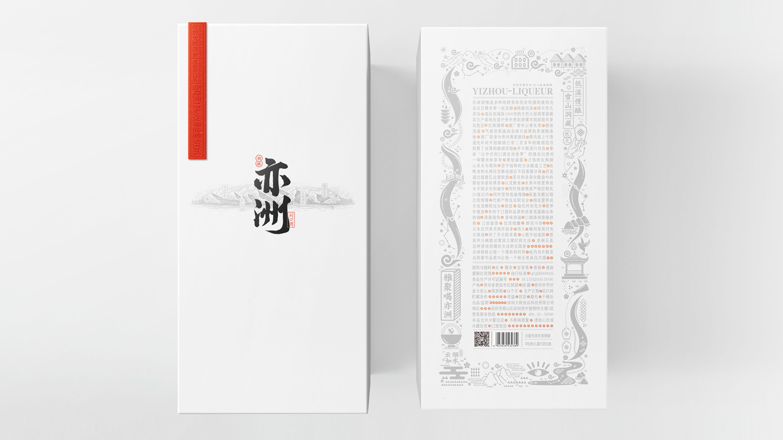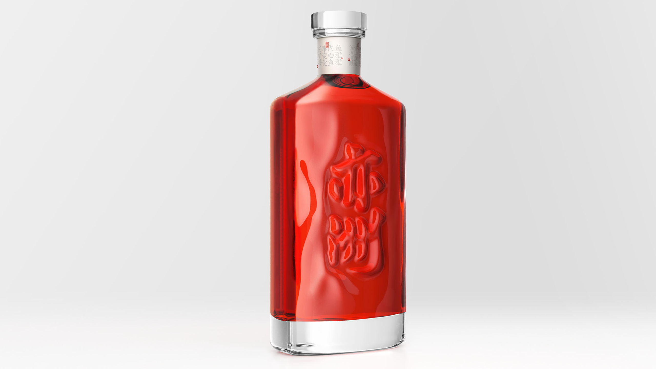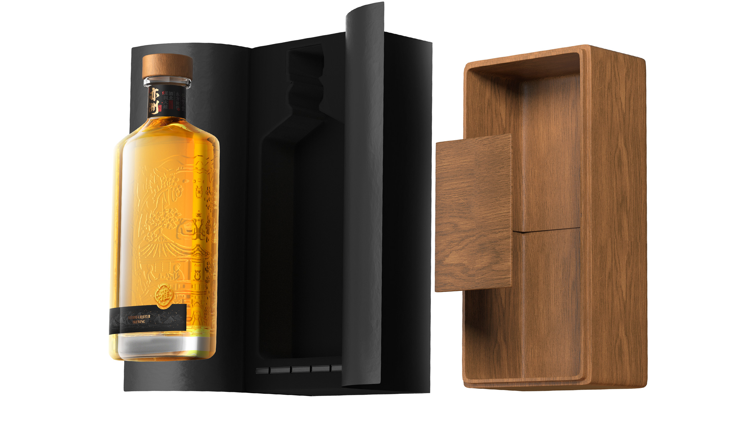 其中“亦洲·雅”的主要原料为“猕猴桃”,其酒体呈现金黄色,我们采用一体开模的方式,将聚饮的场景雕刻在了容器的背面,容器本身是透明玻璃瓶,当金黄的酒体灌满酒瓶后,视觉效果更是美不胜收。“亦洲·风”的主要原料为“桃花”,所以酒体的色泽呈现迷人的“桃红色”。我们在容器的正面,采用精致的图形插画将中国古代“曲水流觞”的典故演绎出来,背面则是在模拟水流一样的非规则造型中凸起了“亦州”二字,其作用除了美观之外,也会让手感更加丰富。