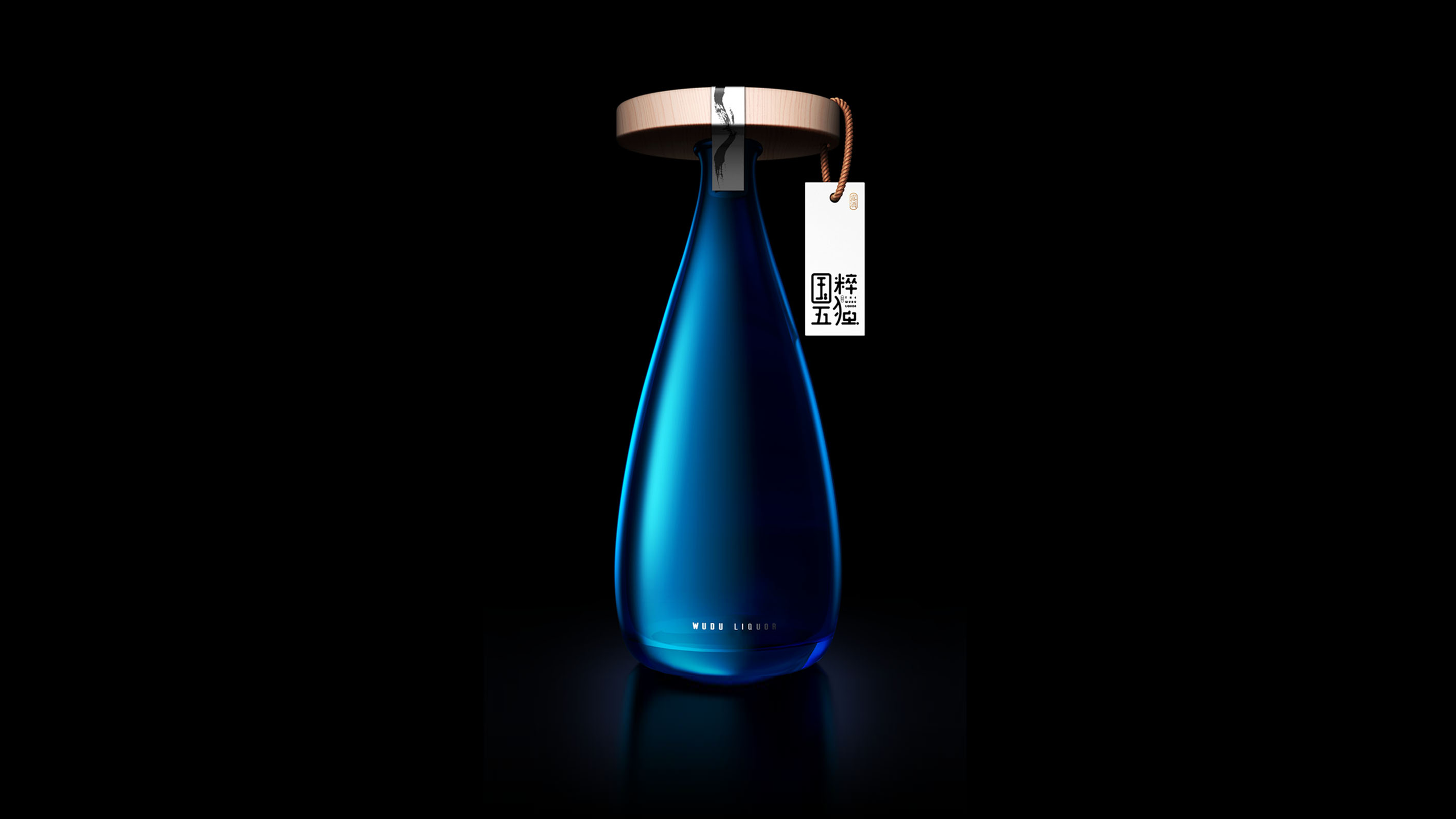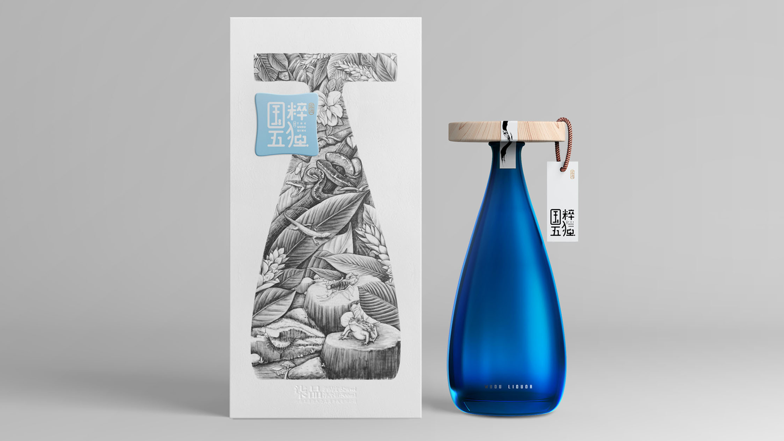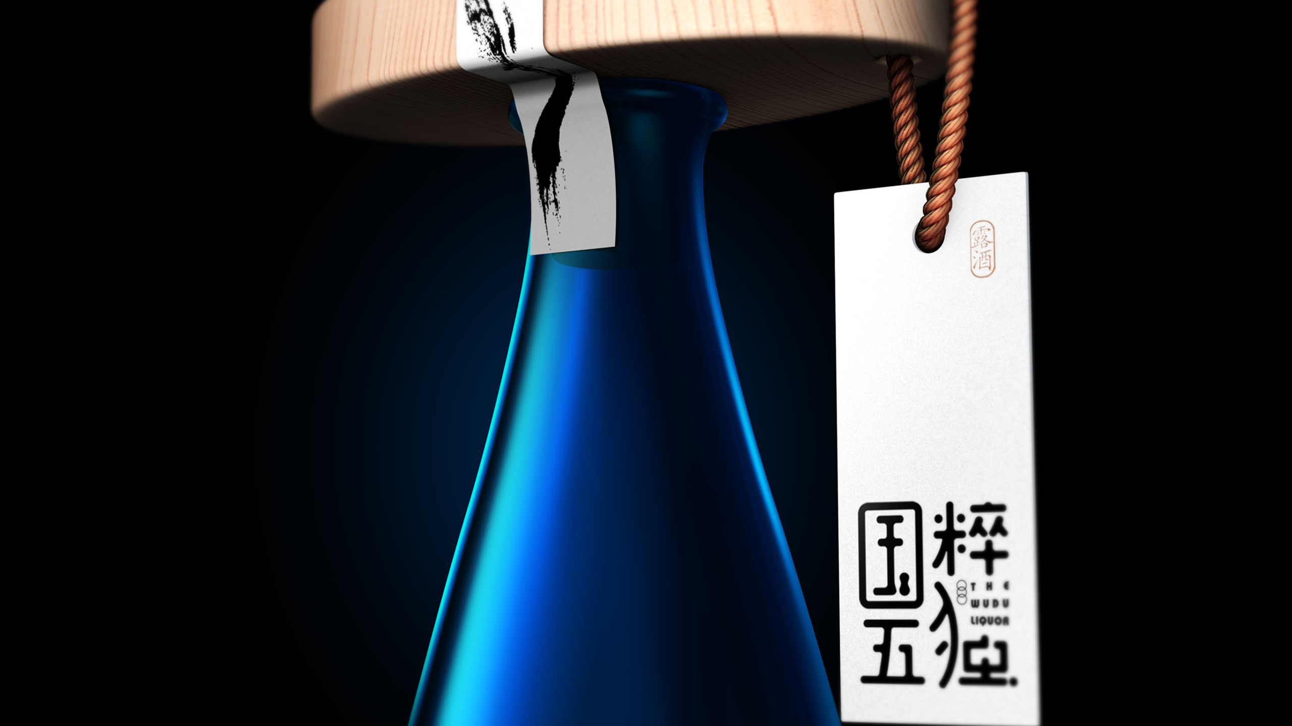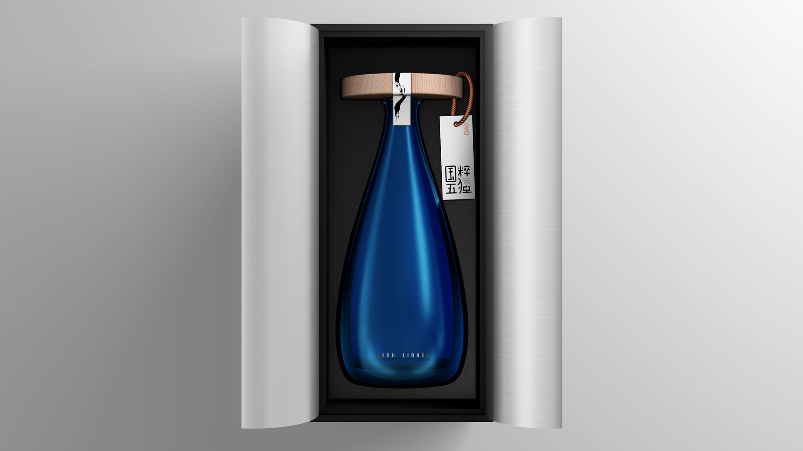 最终,我们采用蓝色的透明玻璃打造出我们的酒瓶,为了让产品见得更加干净,我们将产品名称的中文名称创造性的与产品的瓶盖结合在了一起。这样一来,酒瓶看上去更加干净通透,而整体造型别具一格的同时,又不失强烈的东方韵味,并且与产品本身采用中医理念的酿制手法又达到了不谋而合的状态。