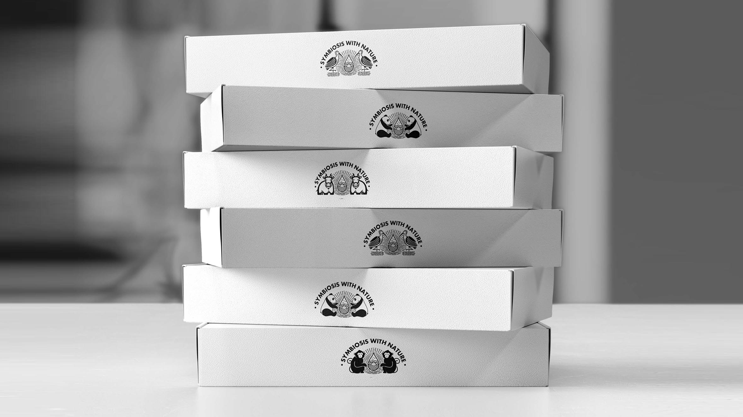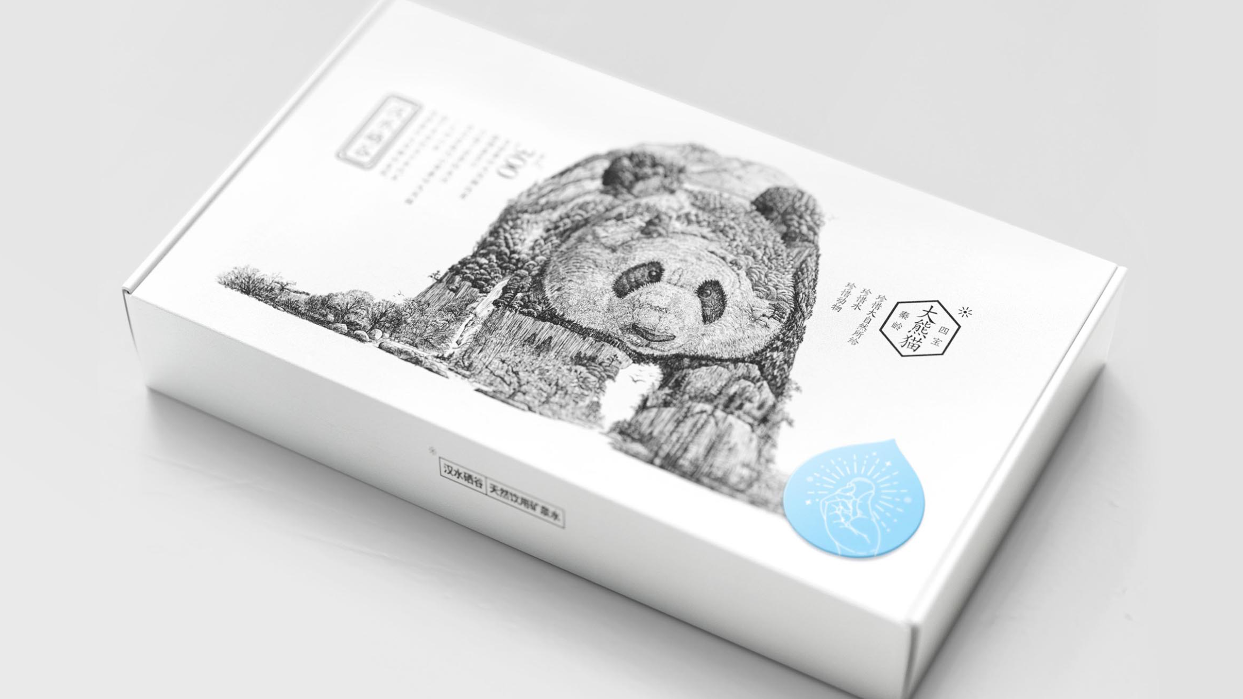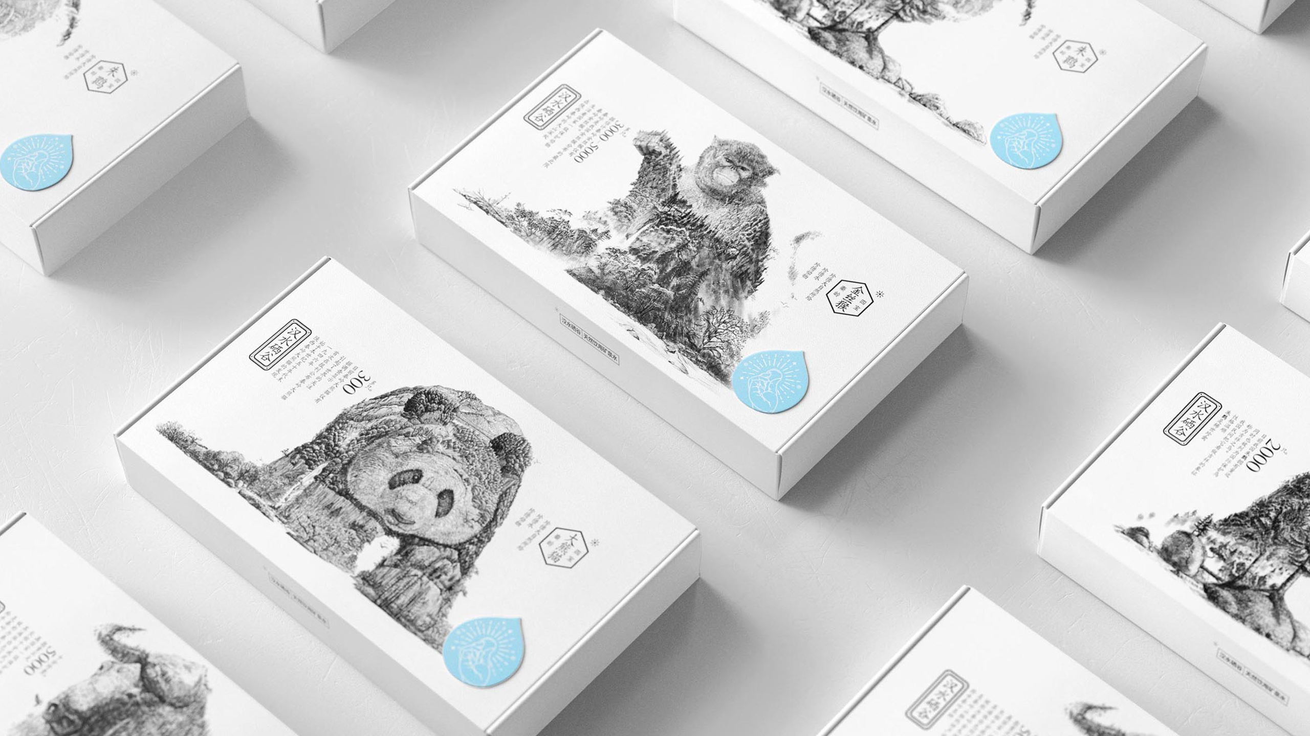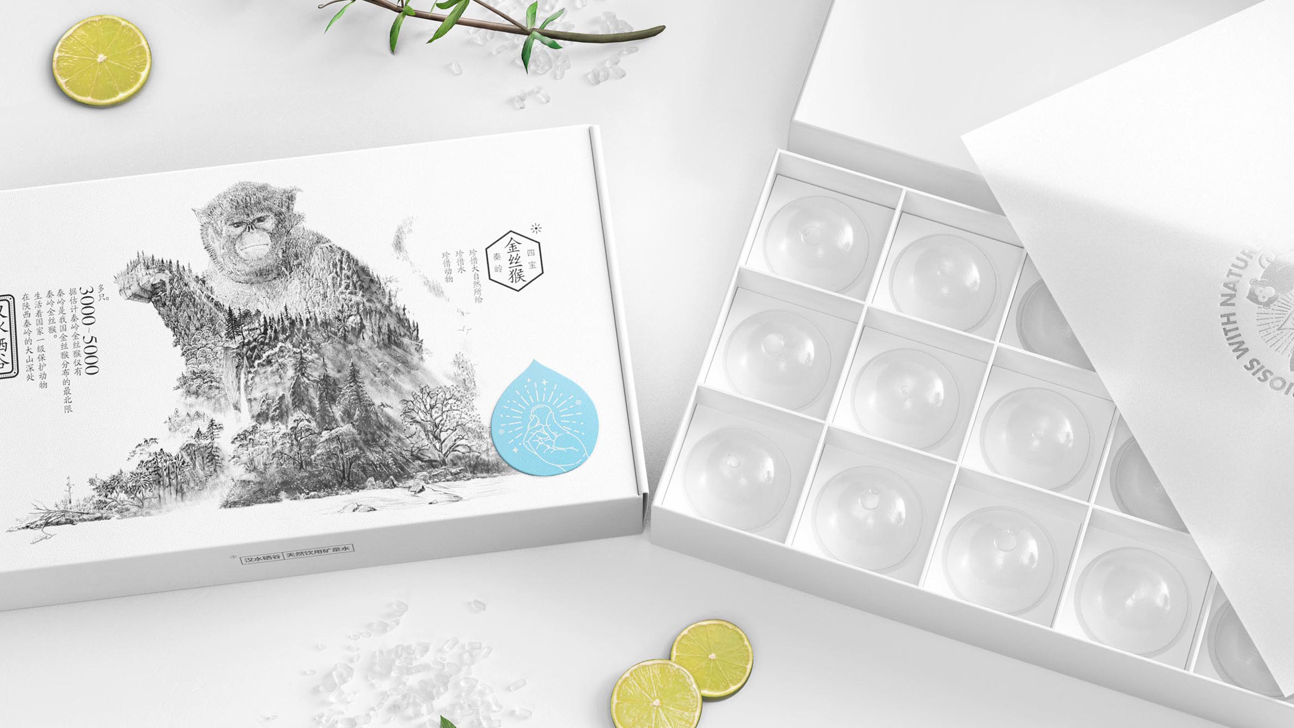 这款限量版产品依旧延续了其视觉亮点,将水源地所在的秦岭作为灵感来源,将大熊猫、朱鹮、金丝猴、羚牛这四种珍稀动物采用手绘的方式运用在包装上,而对于这四种动物的绘制方式,并非是直接将其形态原模原样的刻画出来,而是将这些动物本身的形态与当地的自然风貌进行了巧妙地结合,让画面远看可以看出是哪一种动物,近距离观看又可以看到很多环境细节。但是在产品的造型上,我们放弃了使用常规塑料瓶,而是改用为可食用的水滴状储水容器(也就是在2017年被广泛宣传的Ooho)。商业市场中要大规模的更换掉传统的塑料瓶产品,或许需要一定的时间,而这样一组限量版产品,更重要的是同时提醒着企业方和消费者们,对于环境保护的重视。