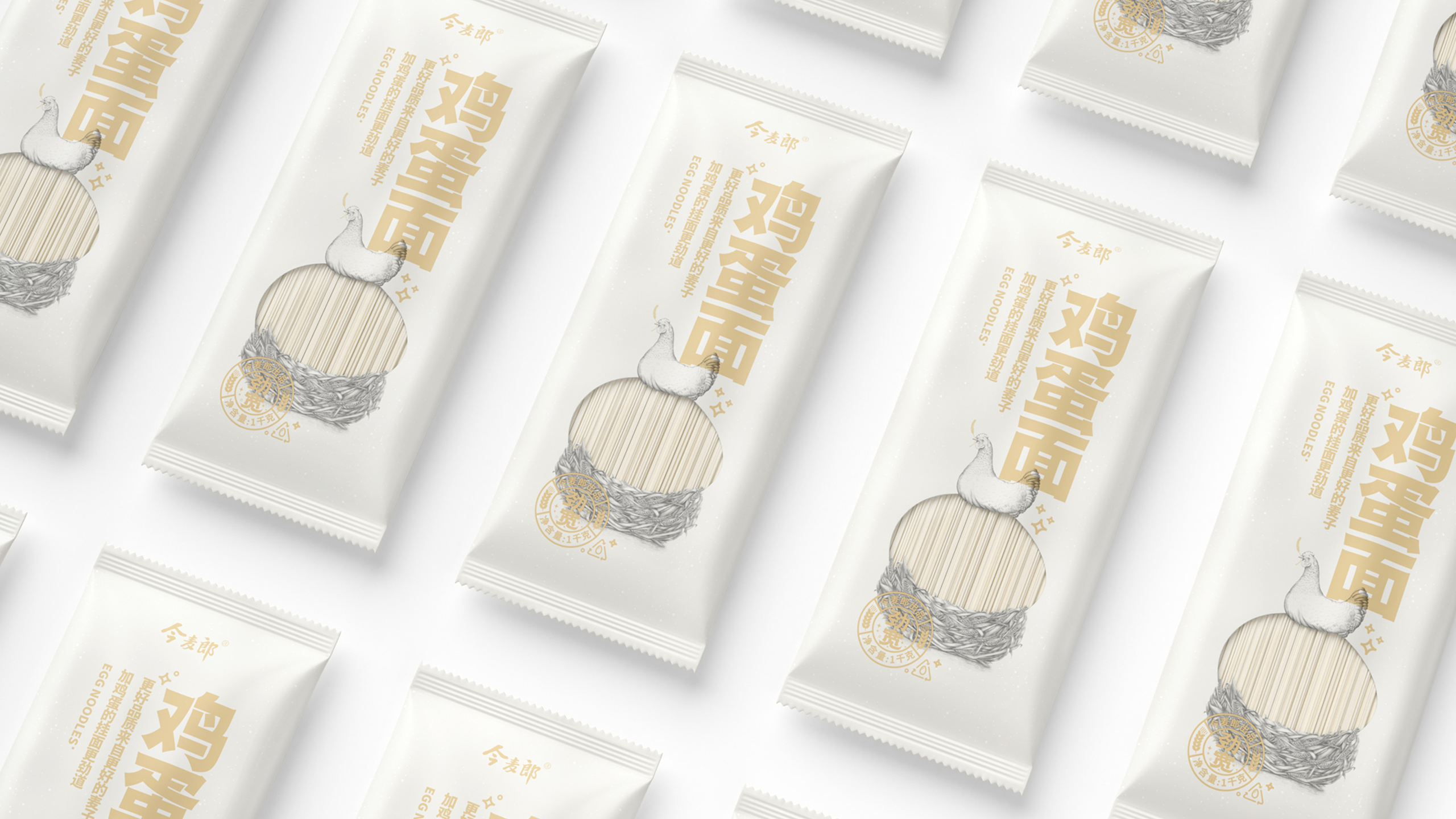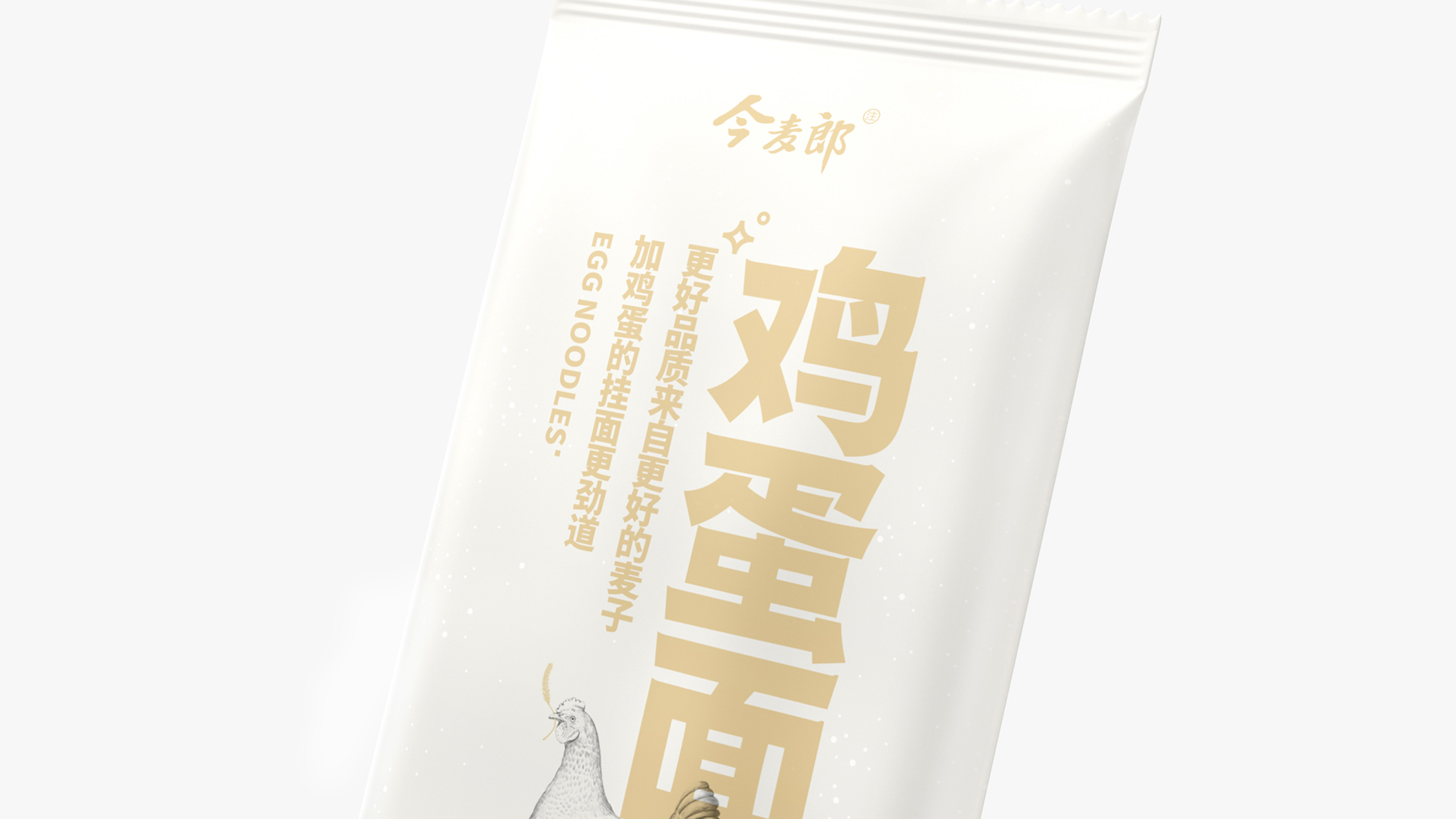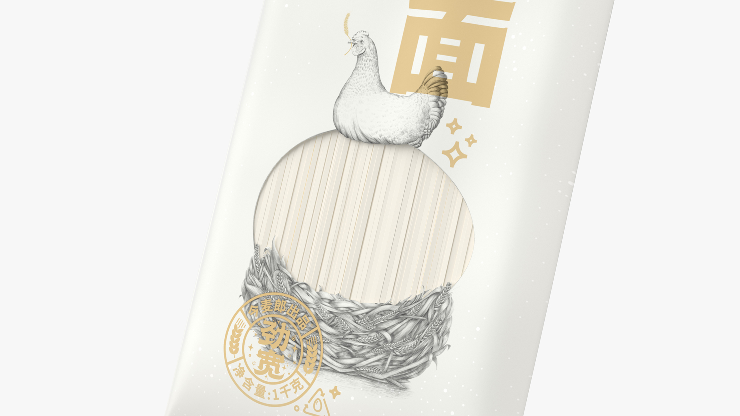 以往的同类型产品在设计时,会选择直接将鸡蛋的图片放置在包装之中进行信息的传递,但那样显然是粗暴且泛滥的。我们在包装正面镂空出一块鸡蛋造型的空白区域,配合手绘的鸡与鸡窝,传递出这款面条不仅有鸡蛋,并且鸡蛋还很新鲜的含义。区别于常规同类型产品外,还让消费者感受到了创意带来的乐趣。