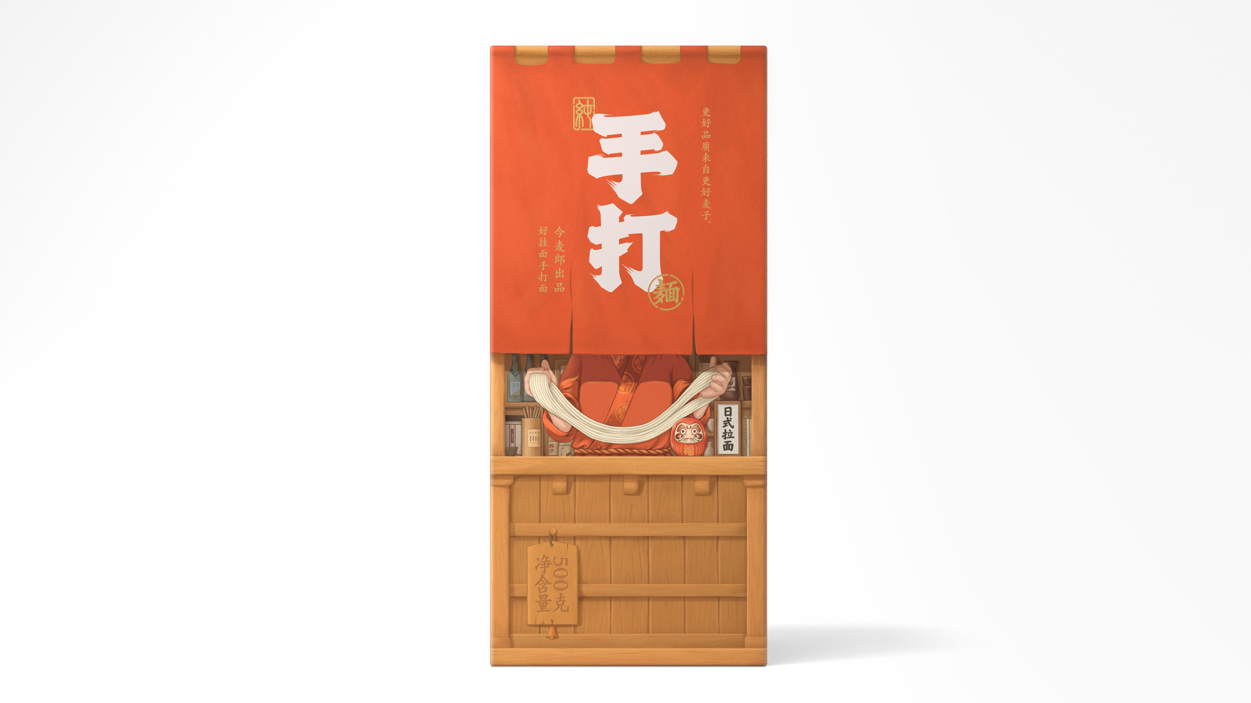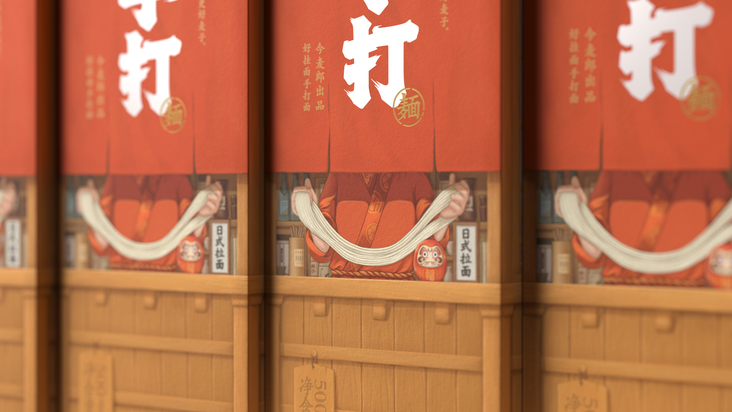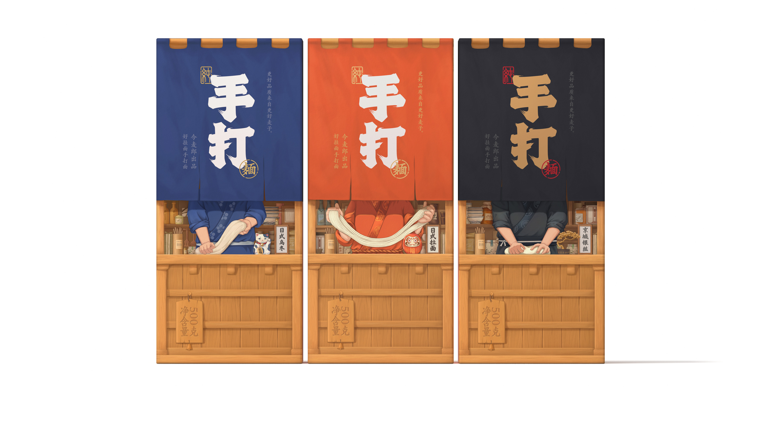 这是一系列面条的包装设计,名为“今麦郎手打面”。这款面条的卖点是其堪比手工面条的口感,于是我们将包装盒设计成拉面屋的样子,人们可以看到布帘的后面有厨师正在对面条进行加工制作,让人第一时间能够感受到面条的劲道与配料的新鲜。