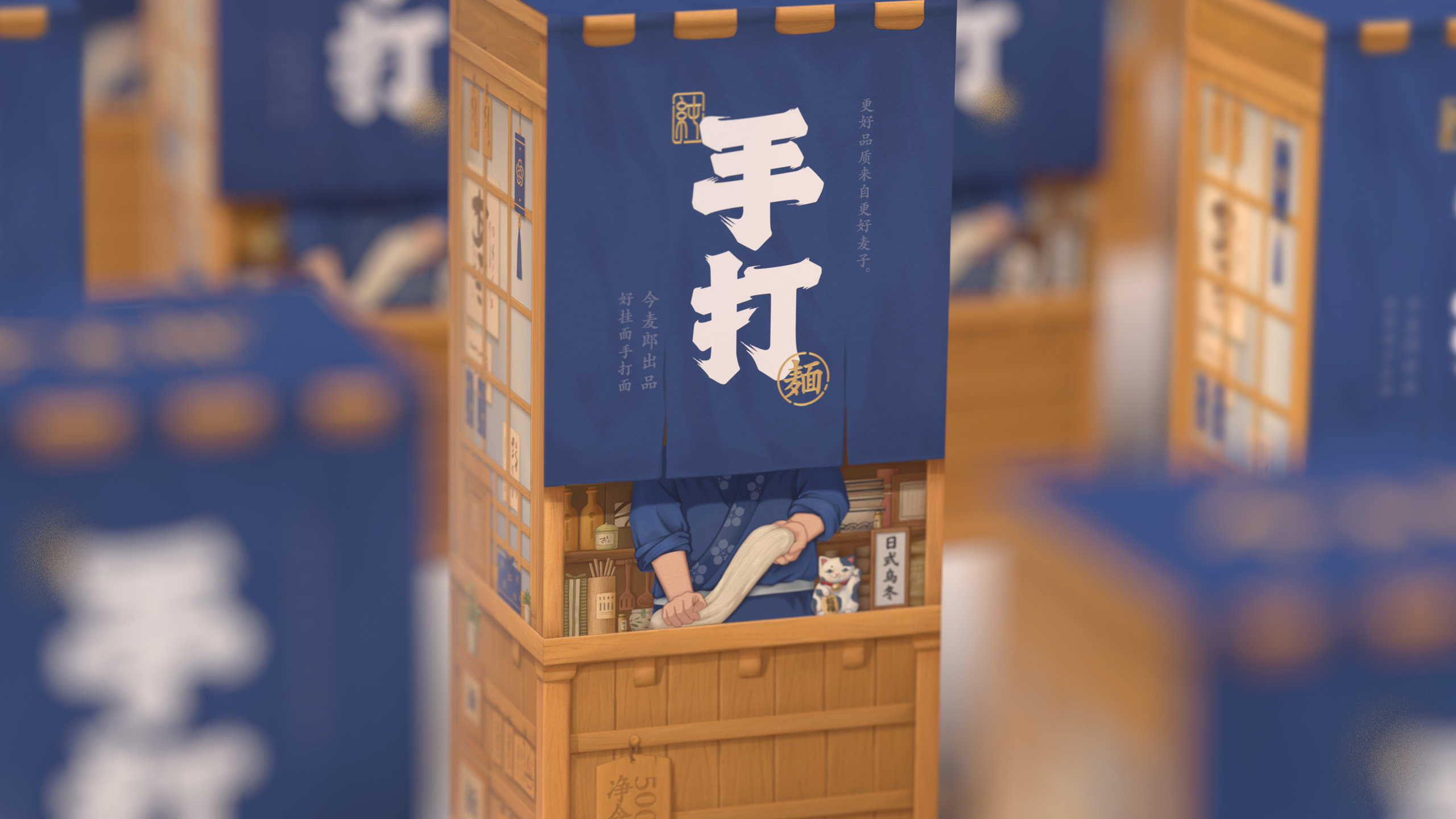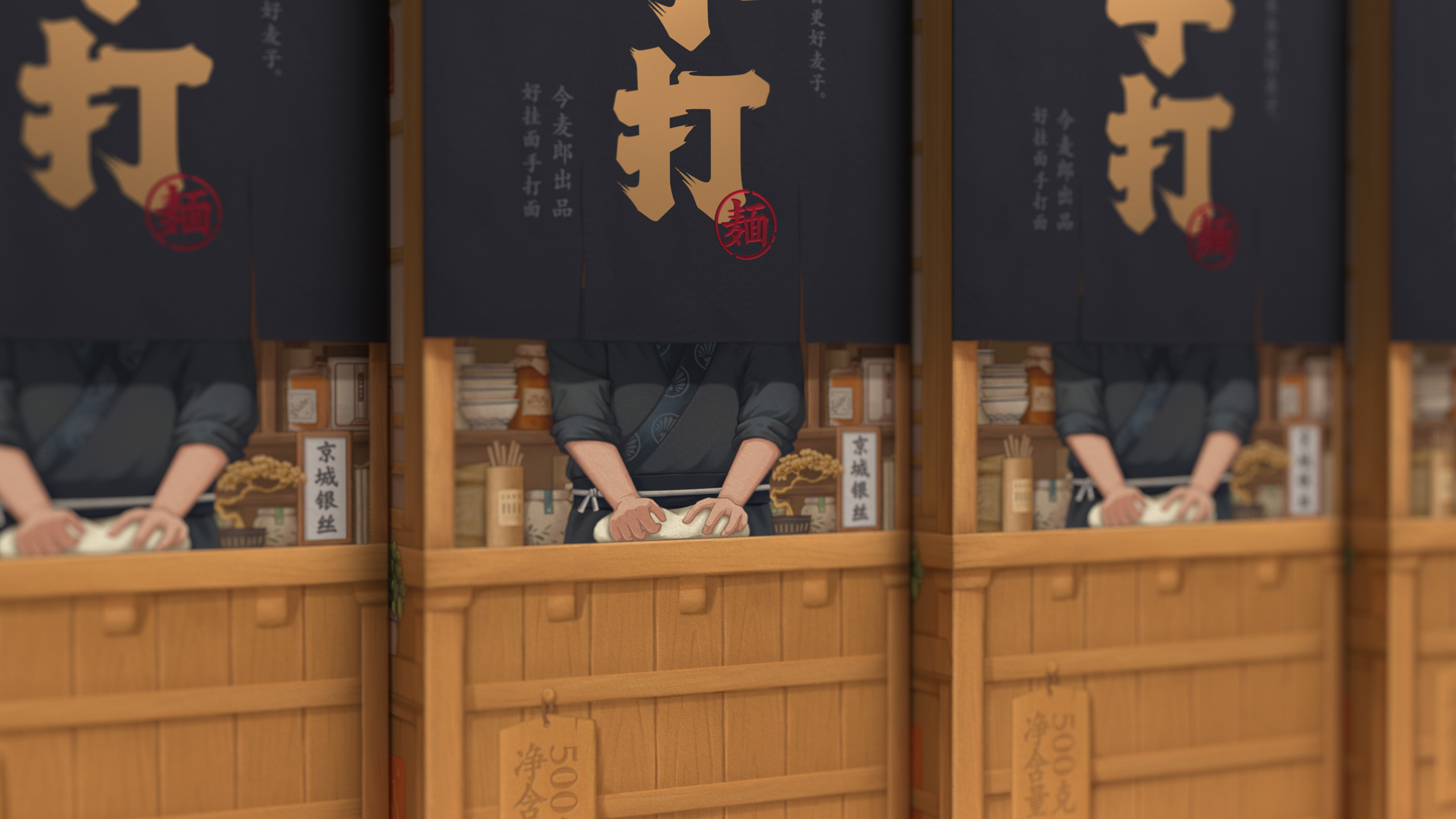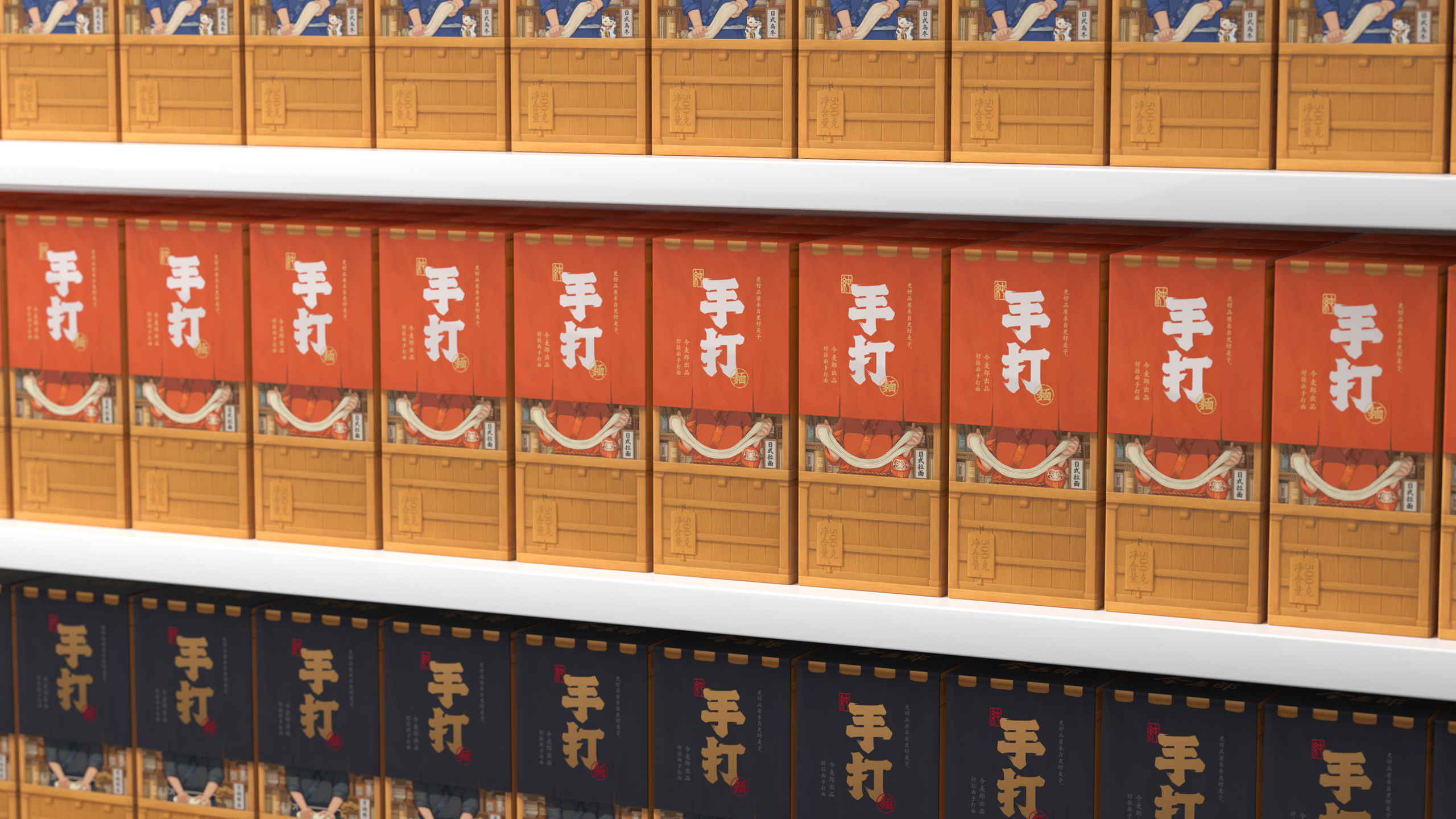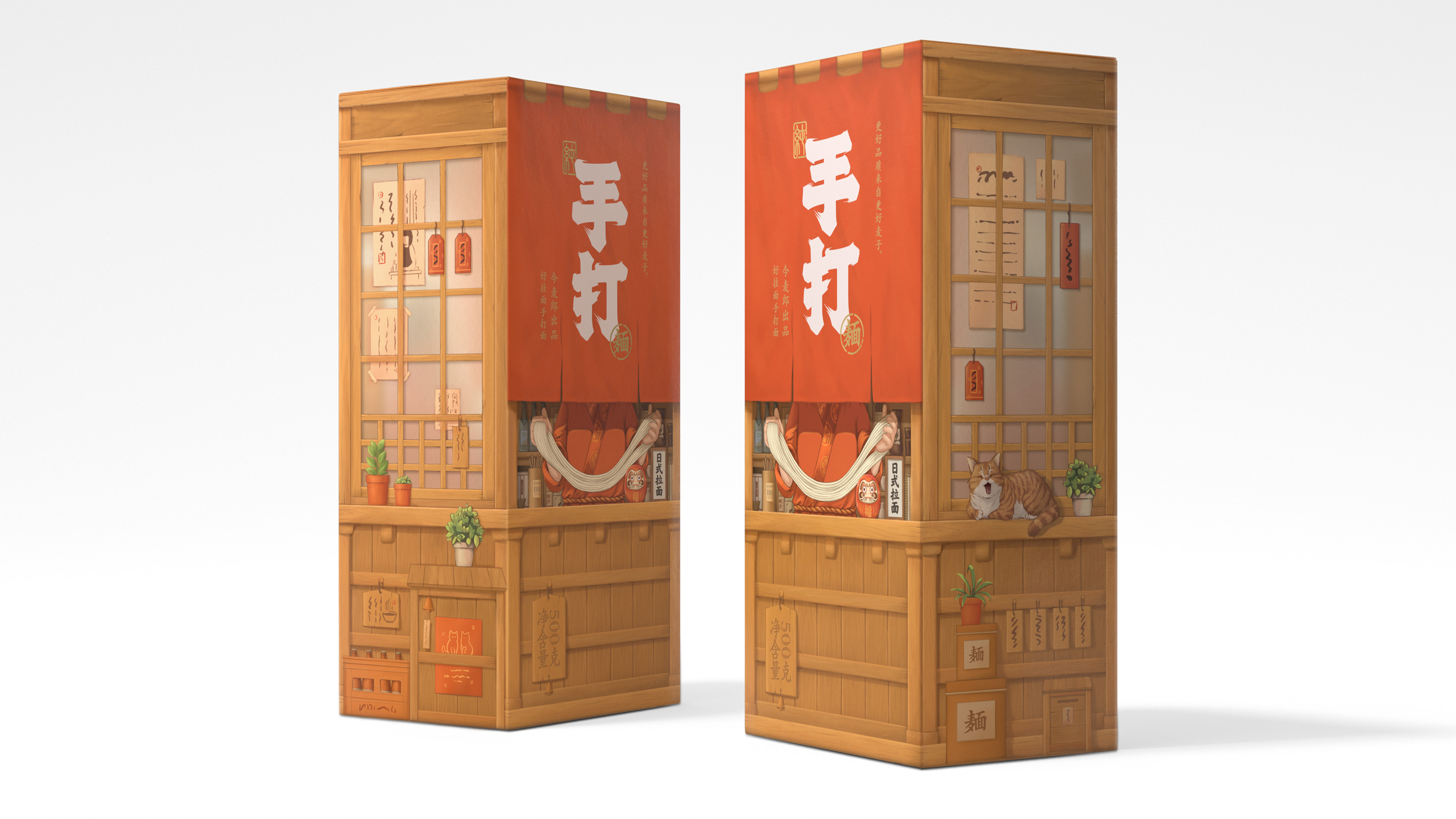 这是一系列面条的包装设计,名为“今麦郎手打面”。这款面条的卖点是其堪比手工面条的口感,于是我们将包装盒设计成拉面屋的样子,人们可以看到布帘的后面有厨师正在对面条进行加工制作,让人第一时间能够感受到面条的劲道与配料的新鲜。