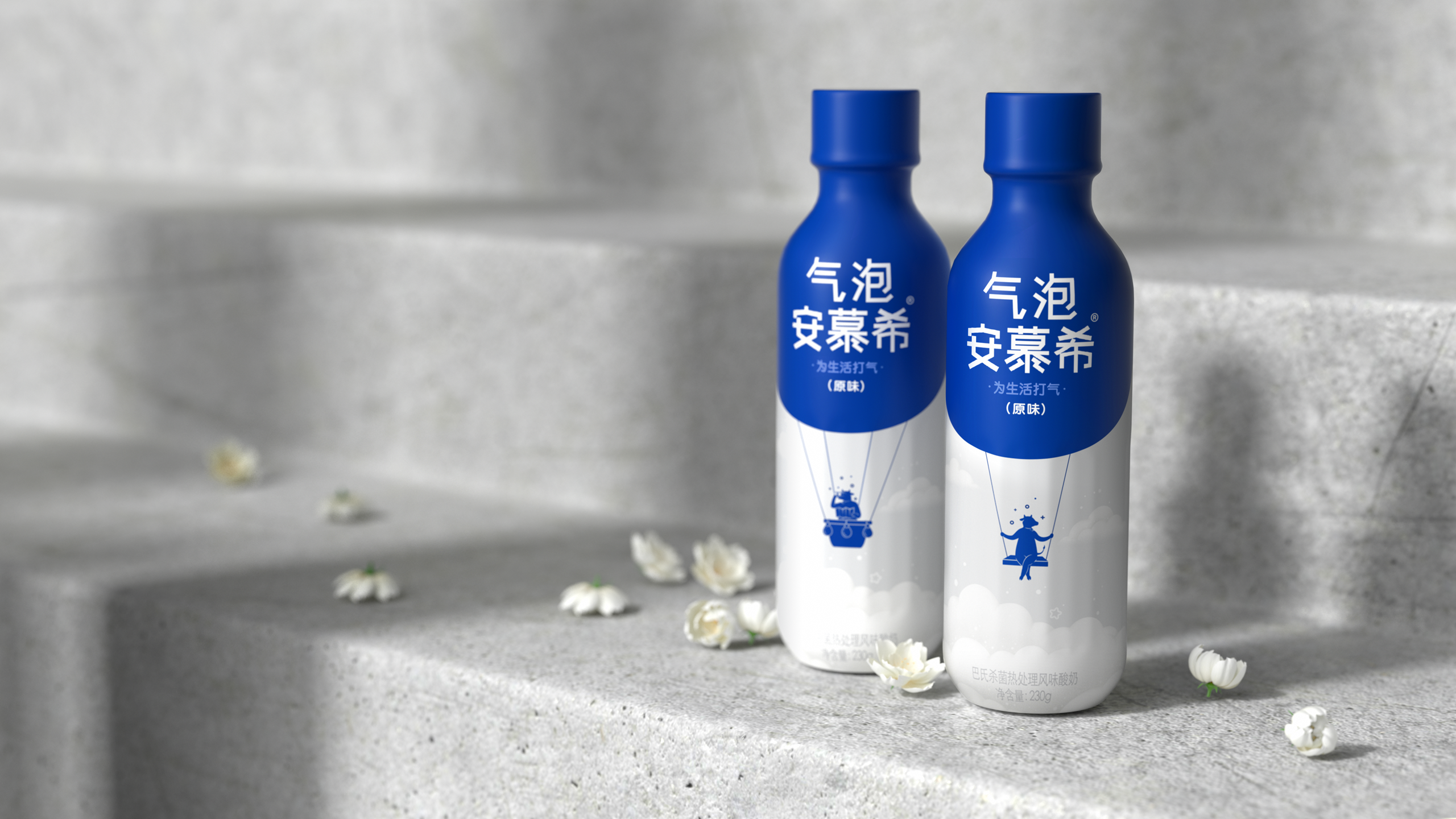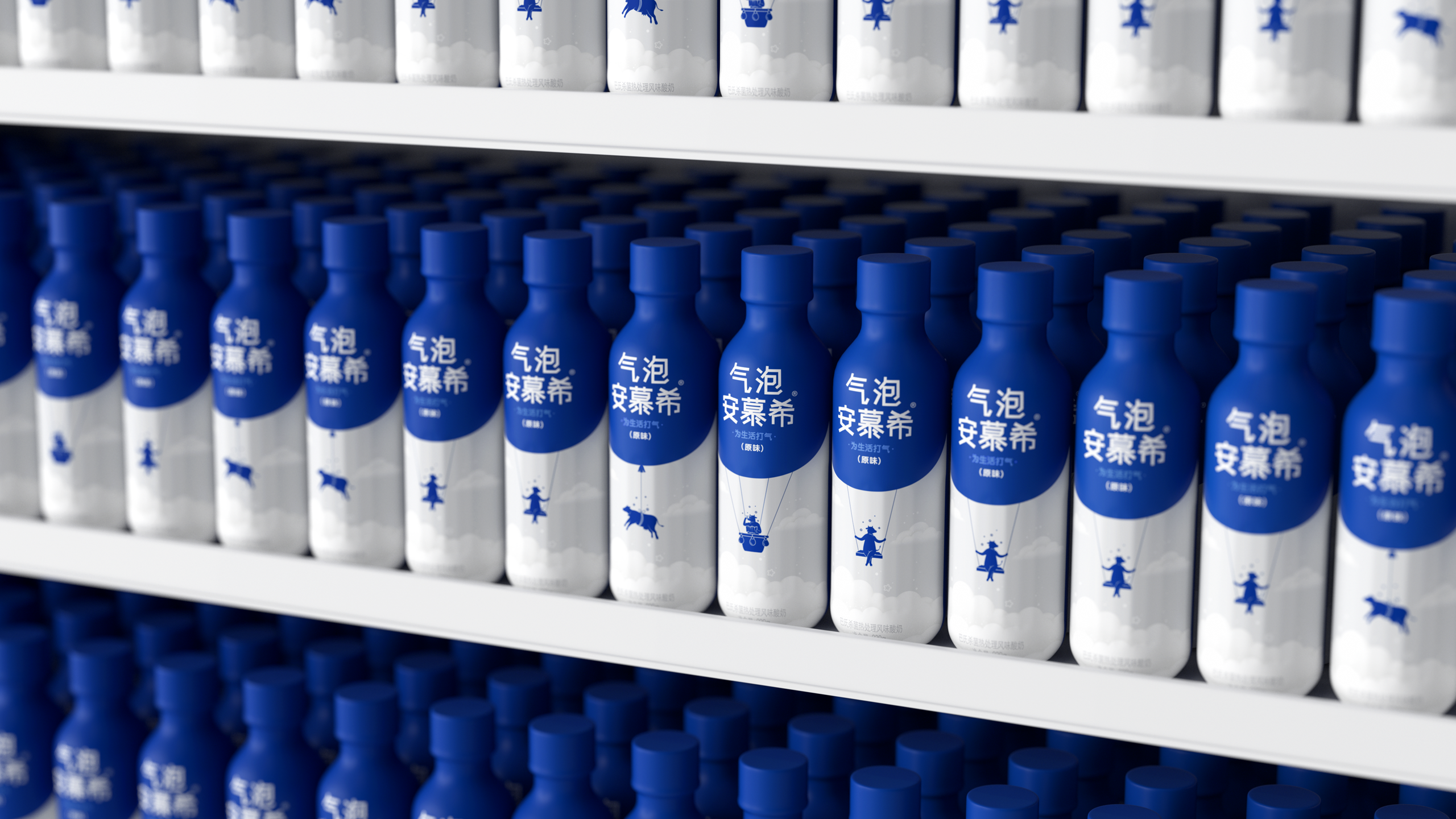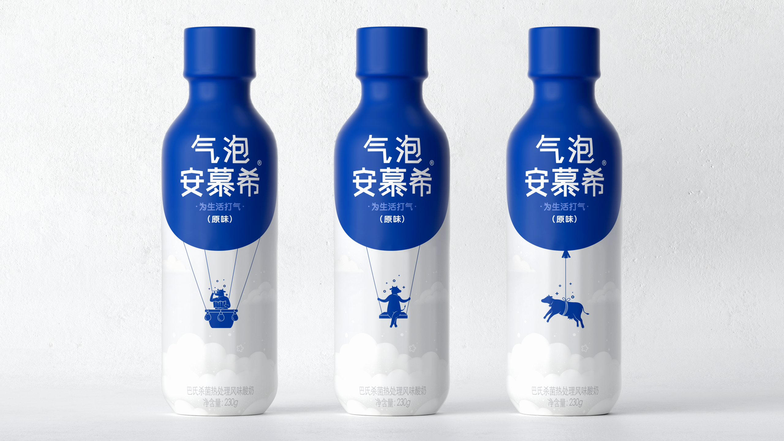 2022年,隶属于伊利集团旗下的酸奶品牌“安慕希”推出了一款含气的酸奶产品,名为“安慕希气泡酸奶”。相比市面上的其他产品,这款酸奶入口后有着和碳酸饮料一样强烈的气泡感。于是我们针对“含气”这一特征用一组气球与奶牛相结合创作的图形作为这款特定产品的视觉表达,因为主要针对的人群以年轻群体以及青少年为主,这样风趣幽默的图形语言能够更快的表达出产品特点,同时也让人记忆犹新。