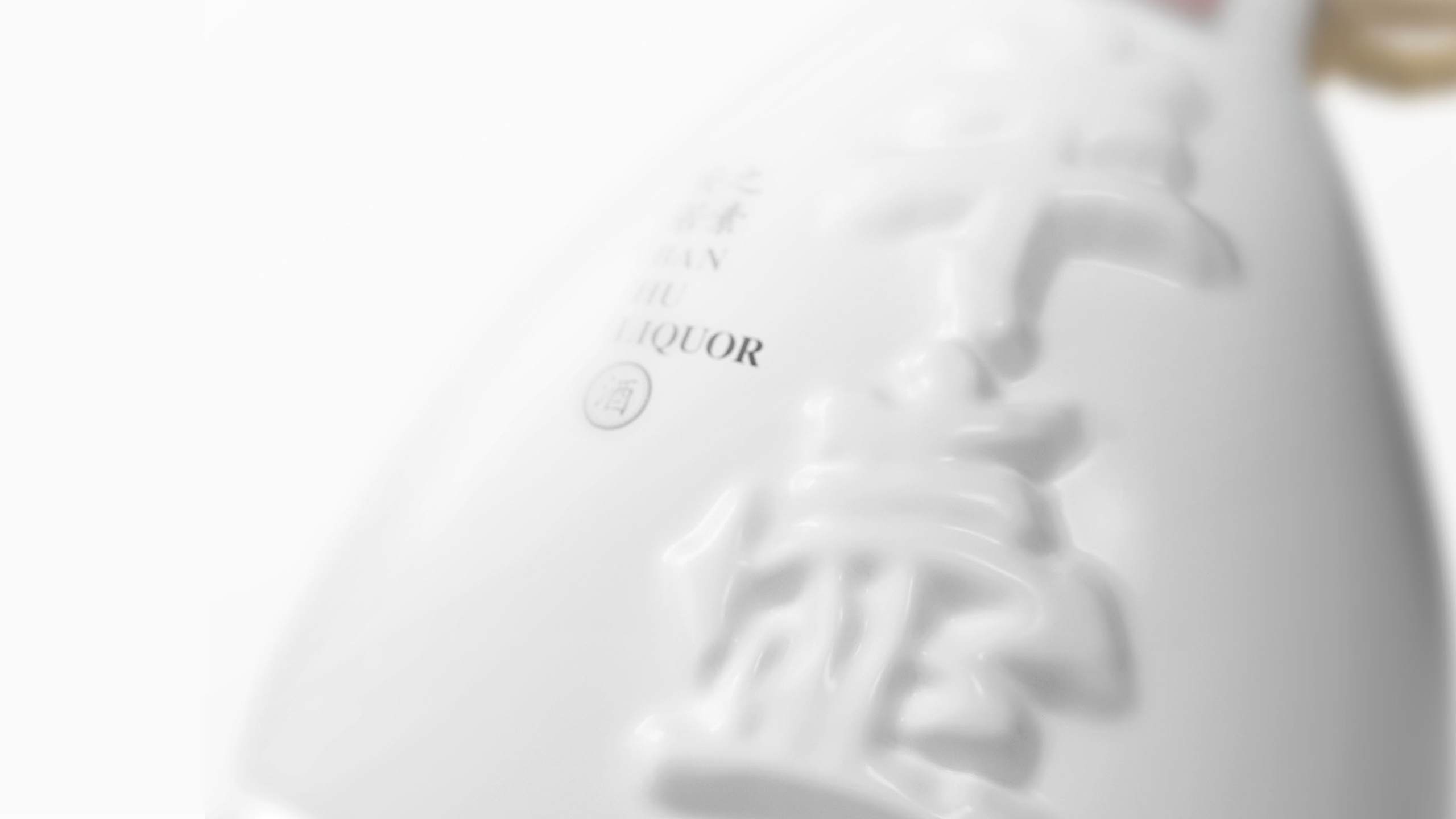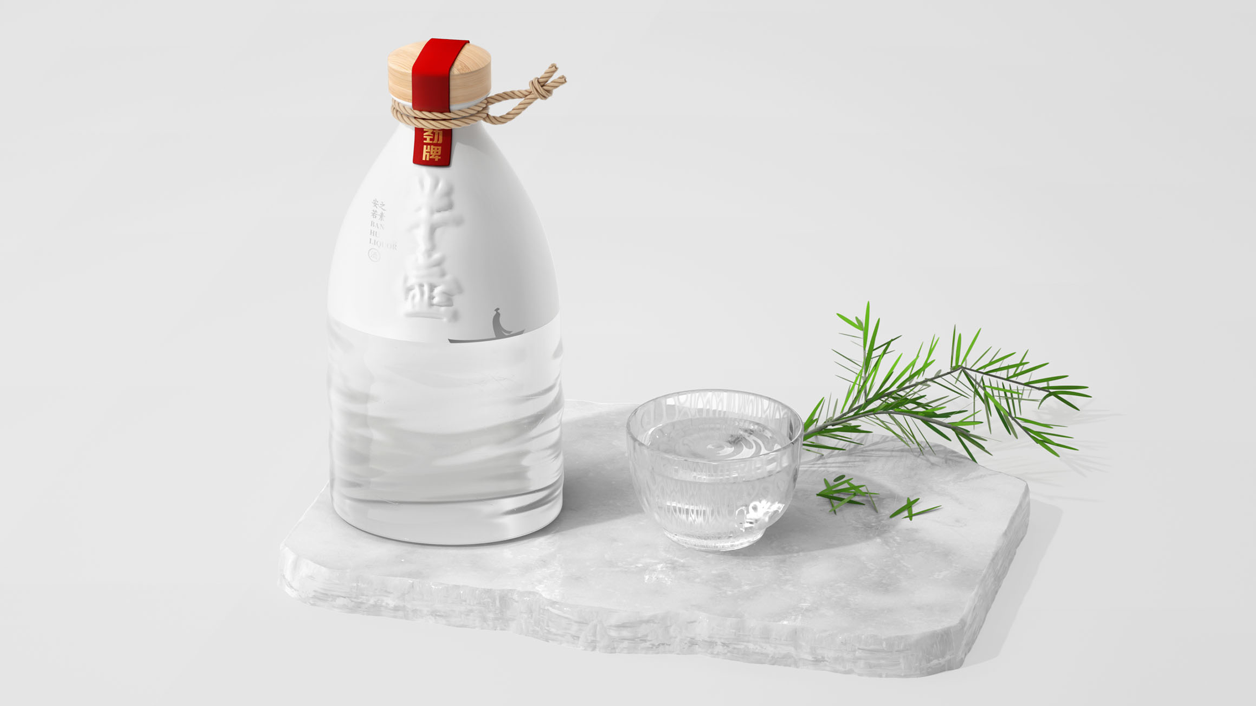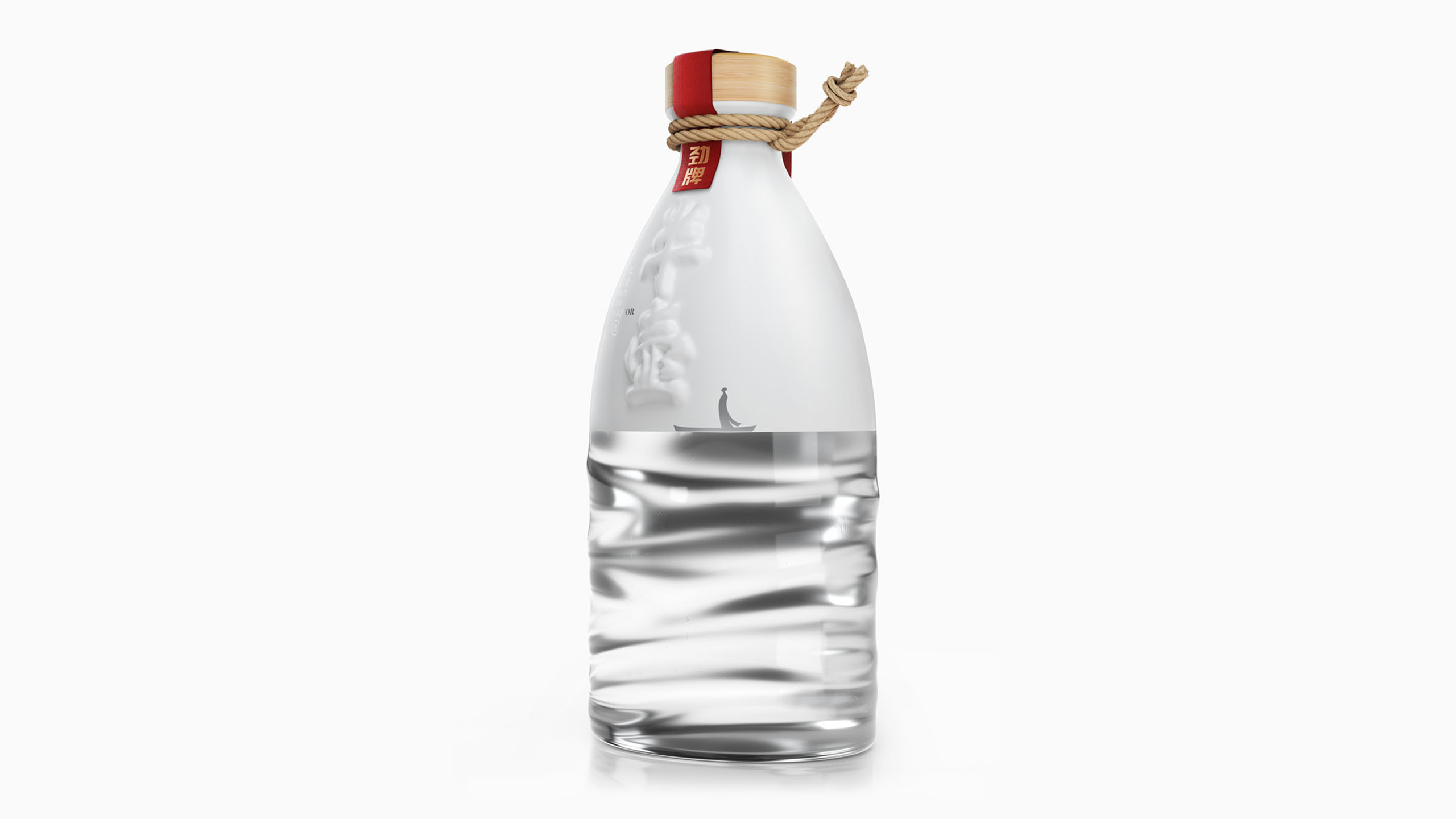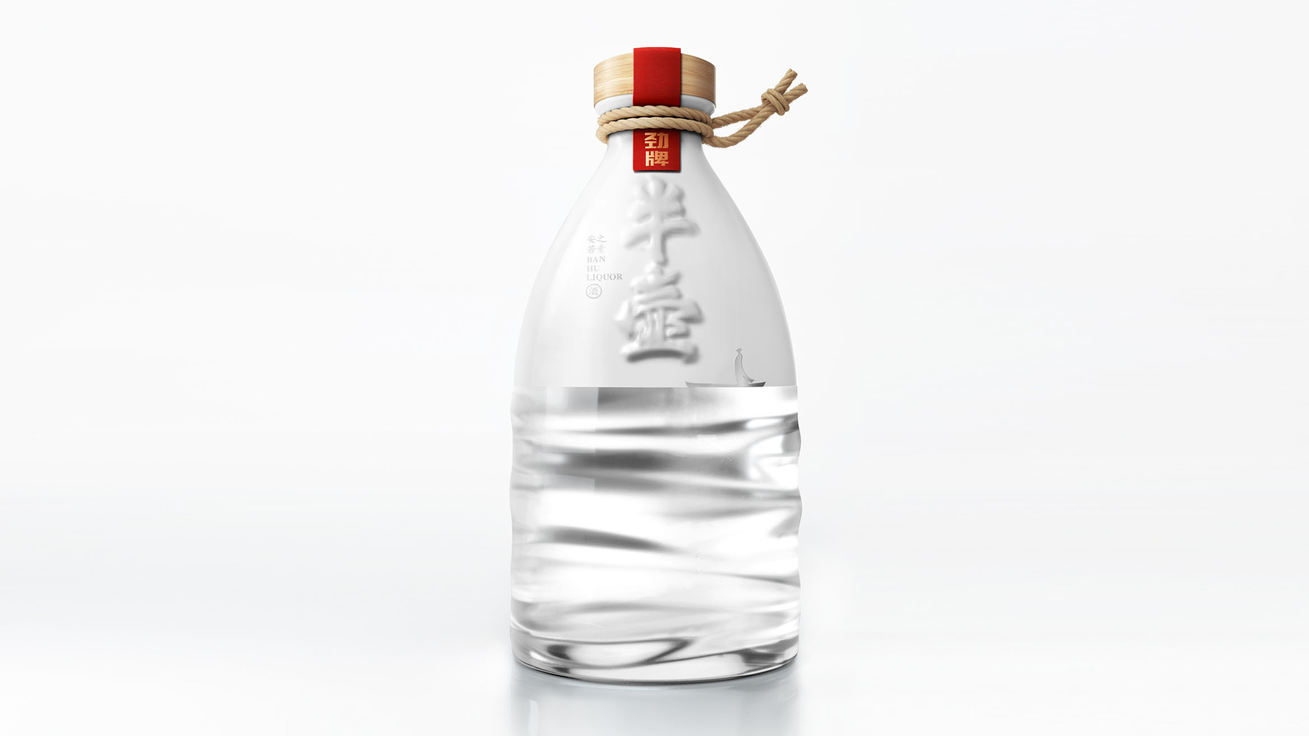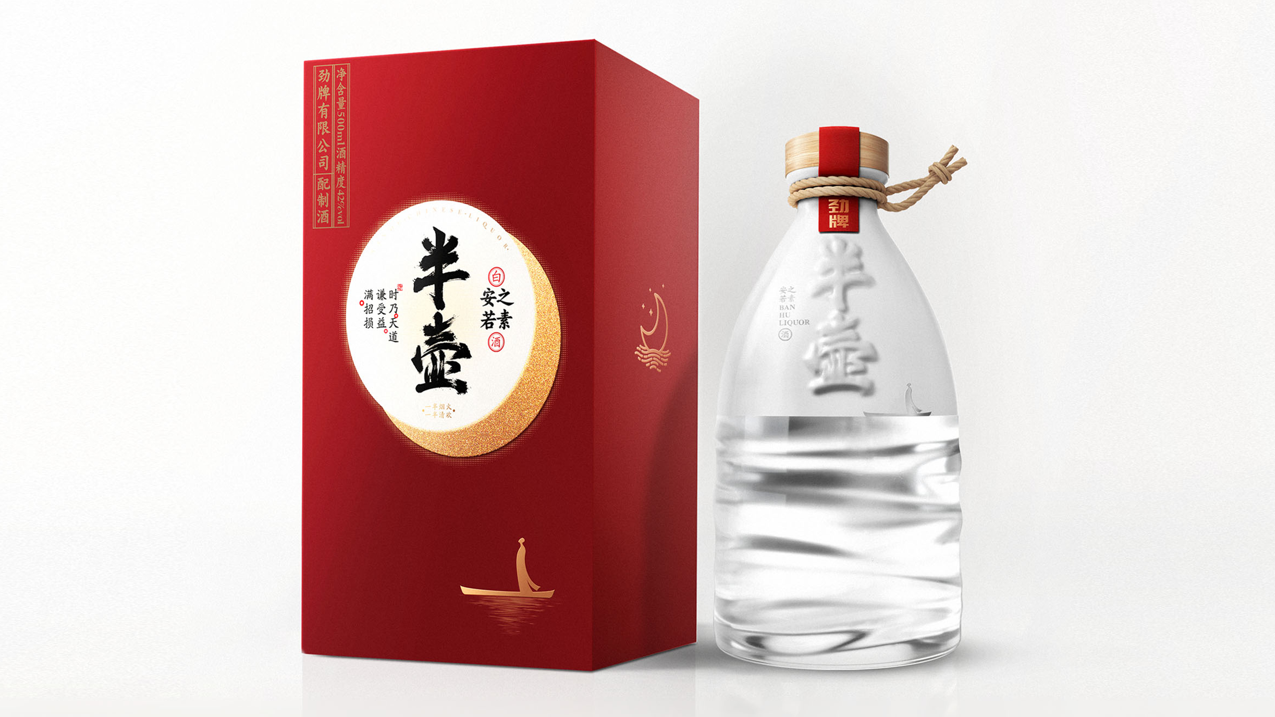 为了避开这样的一个“陷阱”,我们将容器的材料选用了玻璃,再将上半身喷涂成完全遮挡住的白色,下半身则露出玻璃的透明材质,且作出水波荡漾的造型,而在两者中间,采用船只上站有一个抬头望月之人,来营造一种意境。而在包装物上,抬头望月之人所看到的正好是一个由圆形标签切割出来的半月,而这个半月也是用以比喻“人生难得千事满”的一种不完美状态。