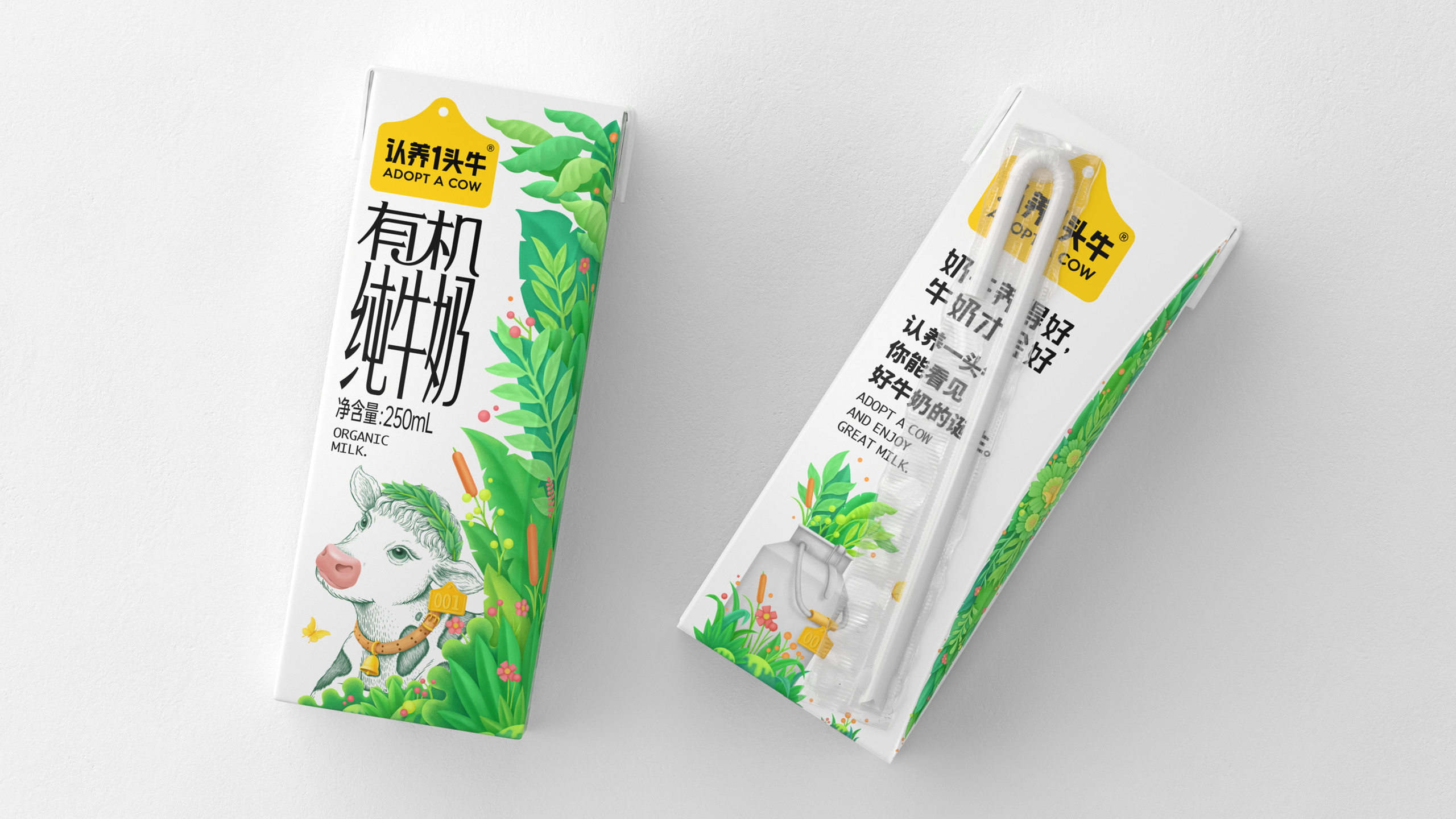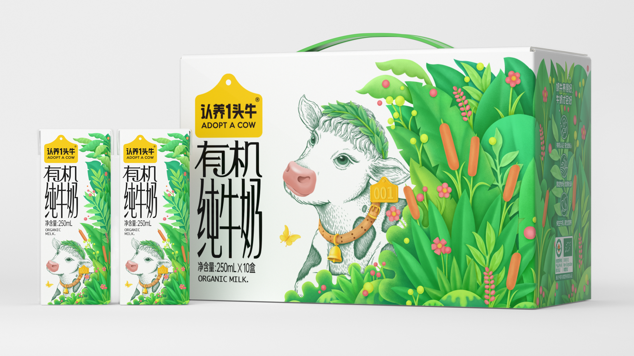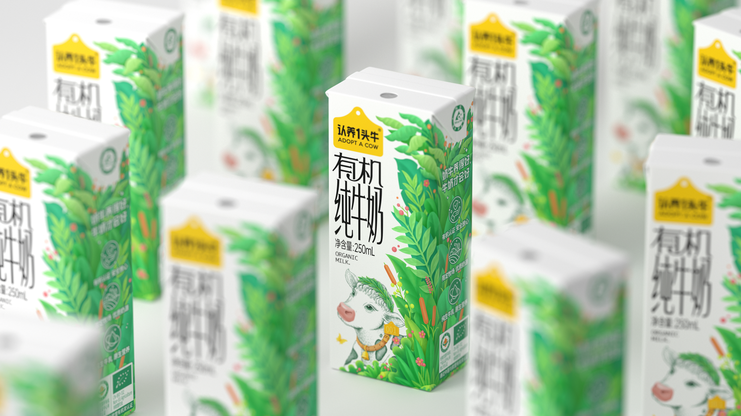 这是“认养一头牛”品牌旗下第一款有机奶产品,提到“有机”,人们总是容易联想到绿色健康之类的感觉,采用植物作为设计元素运用在包装中,而在画面下方,趴卧着一头奶牛,其大部分身体隐藏在了植物丛中,而探出来的脑袋微微仰起,正好将目光注视到了我们的产品名称上,从而形成了很好的点明主题的作用。