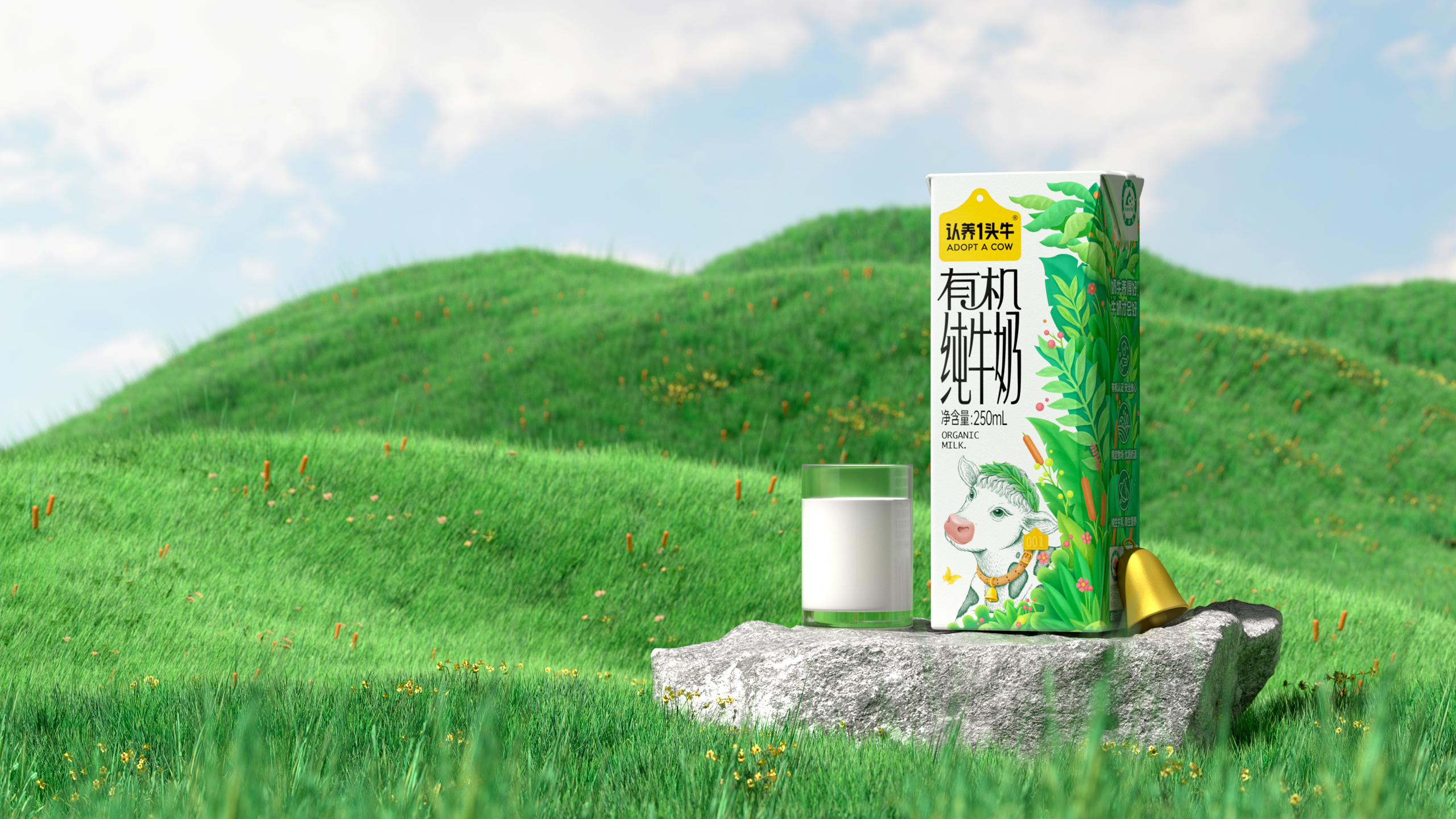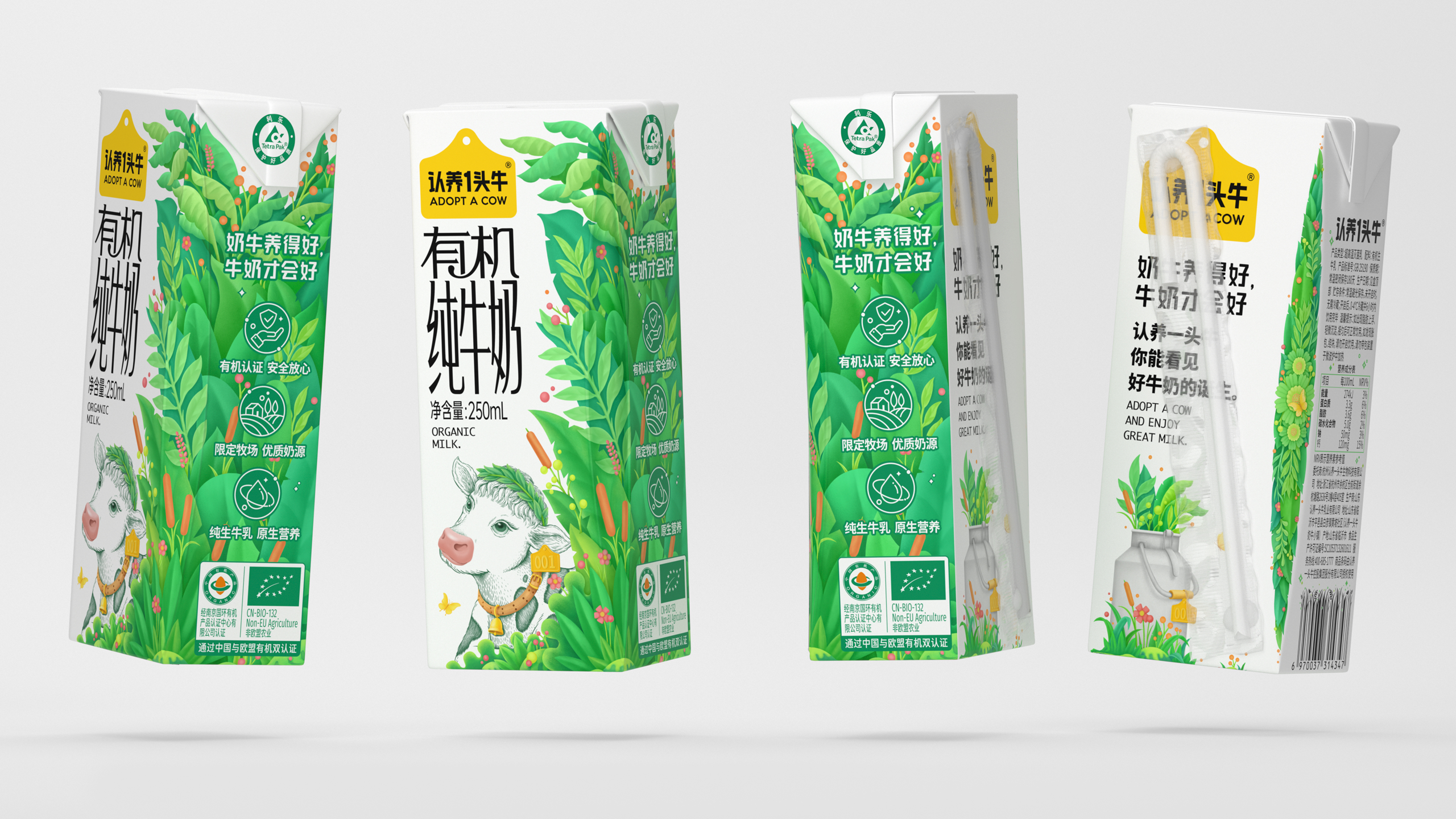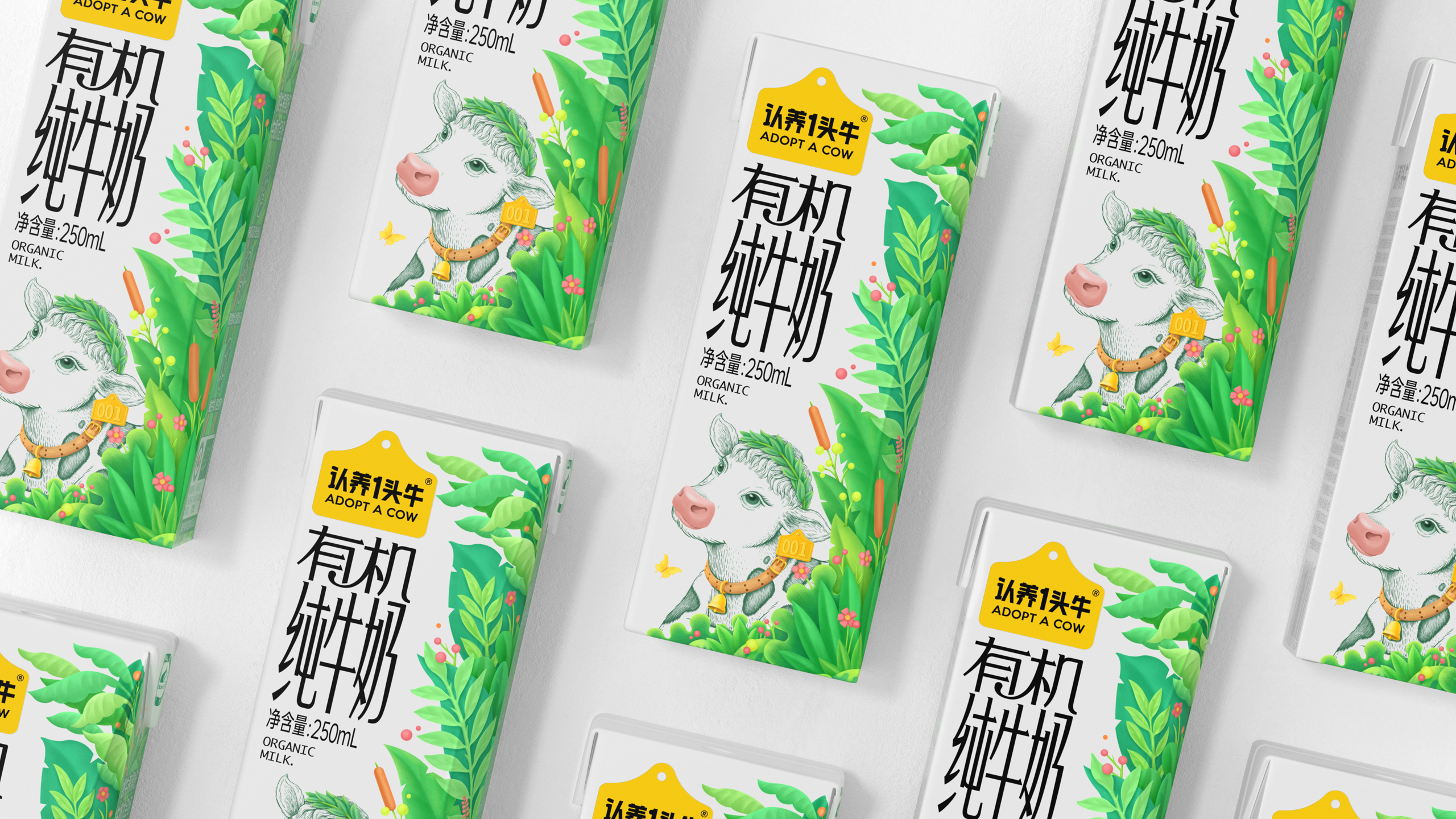 这是“认养一头牛”品牌旗下第一款有机奶产品,提到“有机”,人们总是容易联想到绿色健康之类的感觉,采用植物作为设计元素运用在包装中,而在画面下方,趴卧着一头奶牛,其大部分身体隐藏在了植物丛中,而探出来的脑袋微微仰起,正好将目光注视到了我们的产品名称上,从而形成了很好的点明主题的作用。
