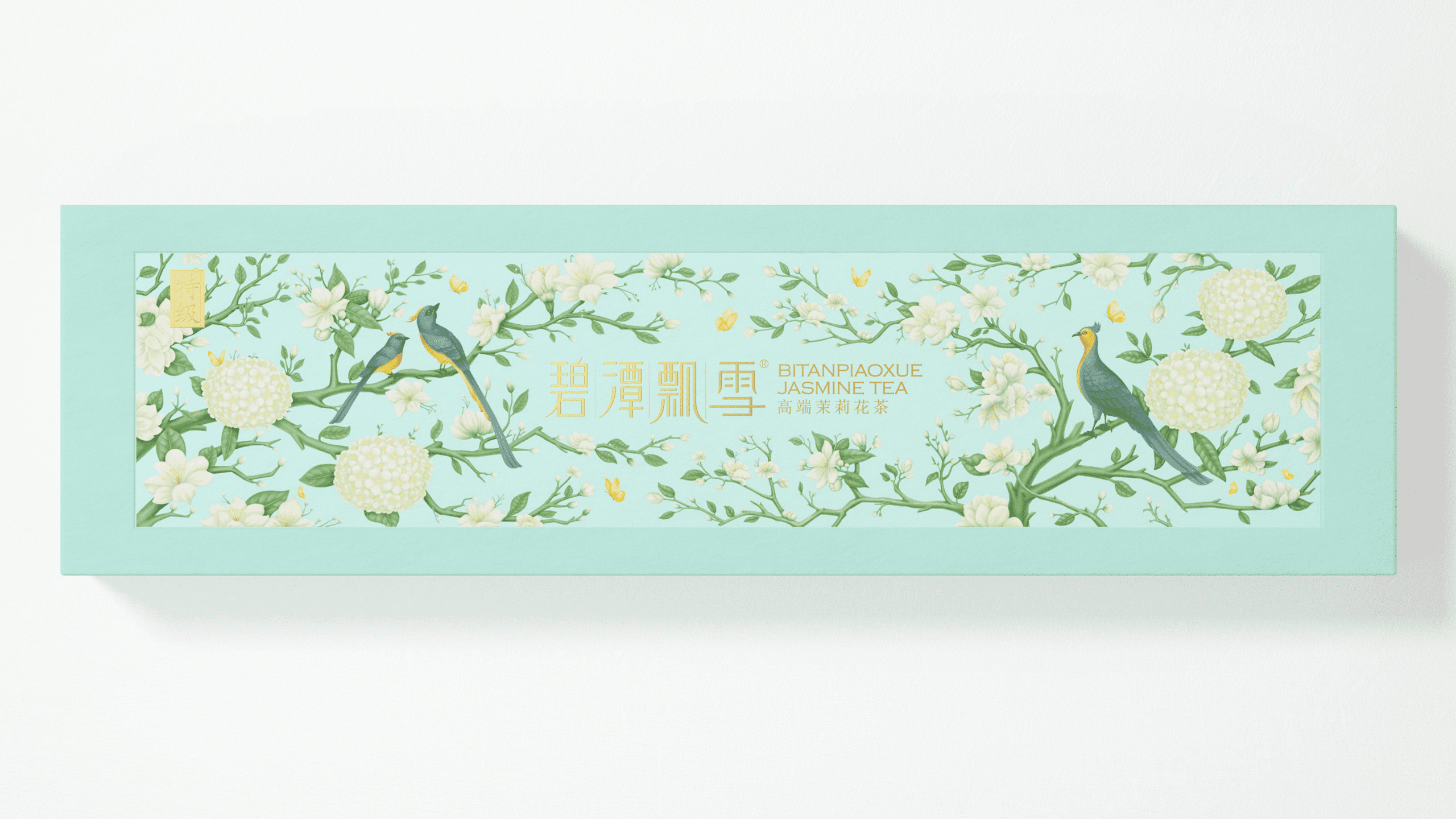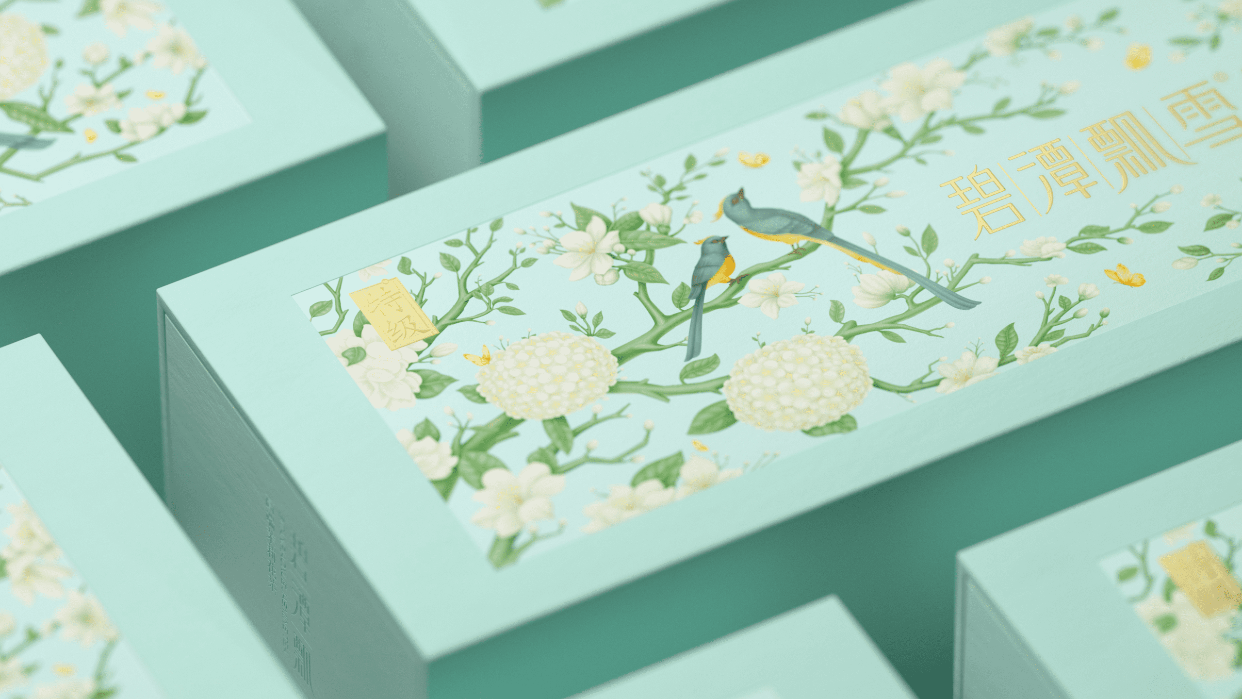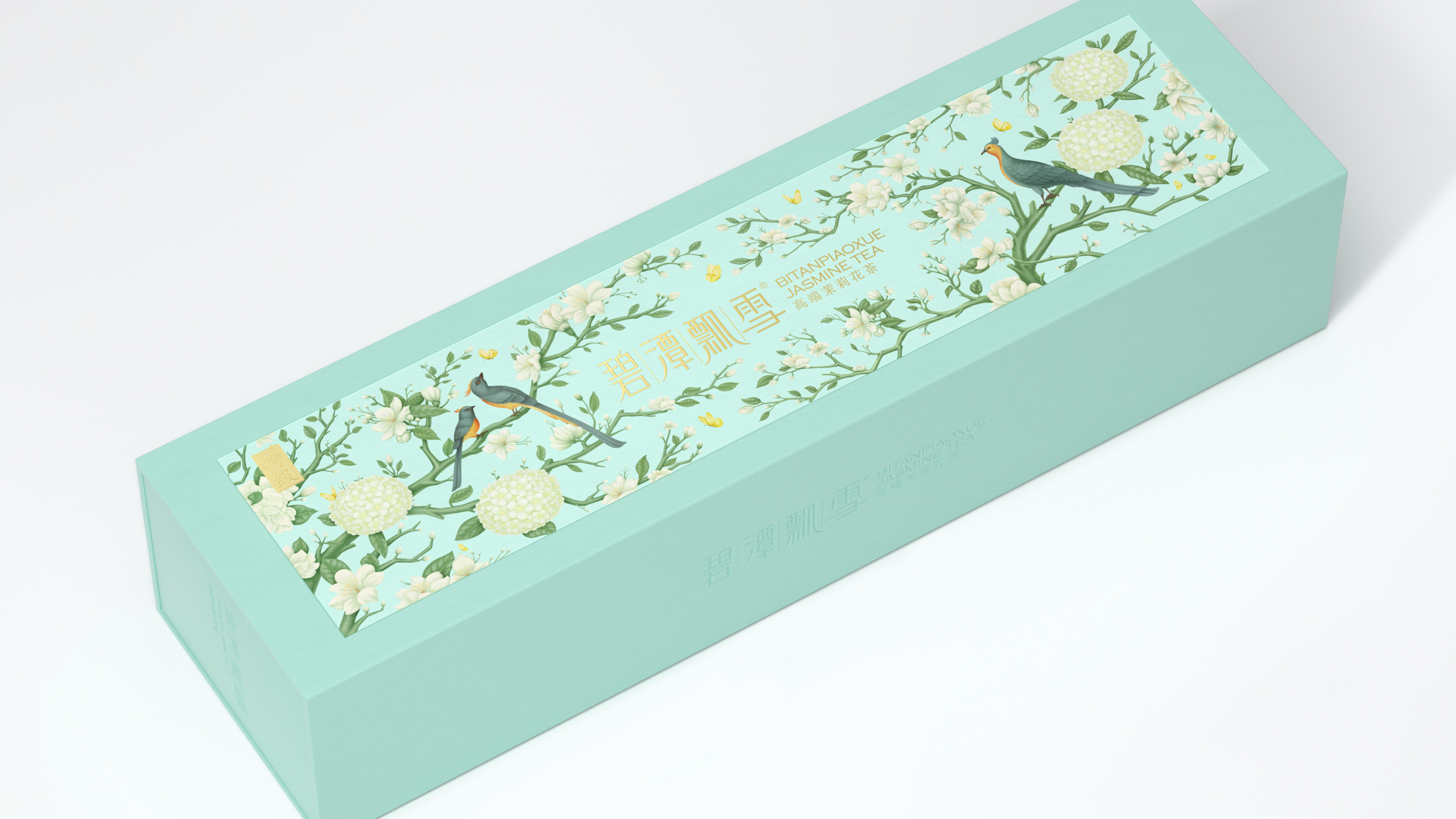 其醇香的口感与风味也让许多年轻群体所喜爱,于是我们尝试打破原有克制的设计语言,转为丰富且细腻的基调来呈现这款产品升级。在保持长条形礼盒的前提下,我们将茶树与茉莉花进行了插画融合,表现在了礼盒正面的贴纸上,点缀以灵动的鸟类,以打破这种纯粹的寂静。在原产品浅调青绿的色调中,更显典雅与生动。