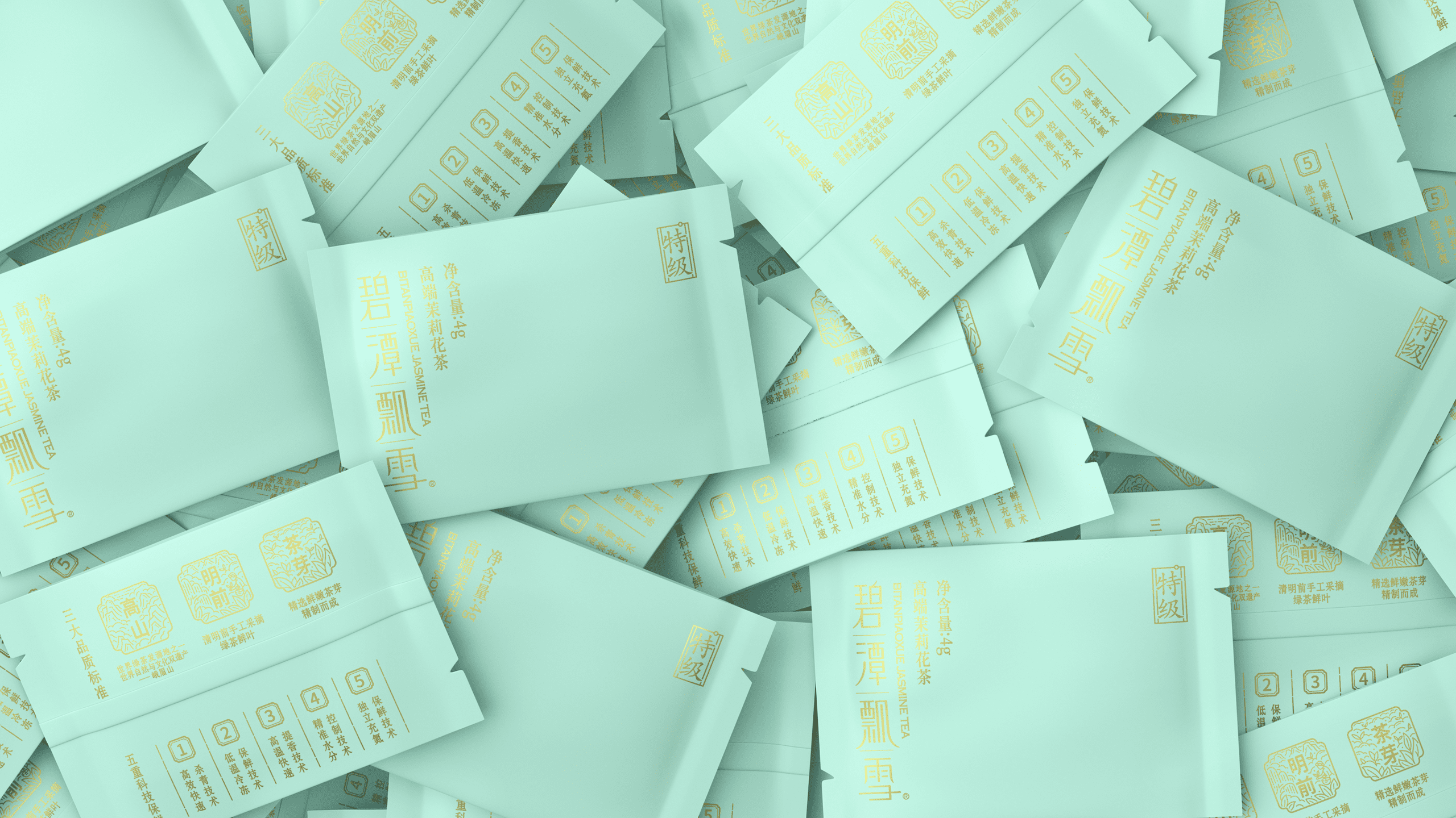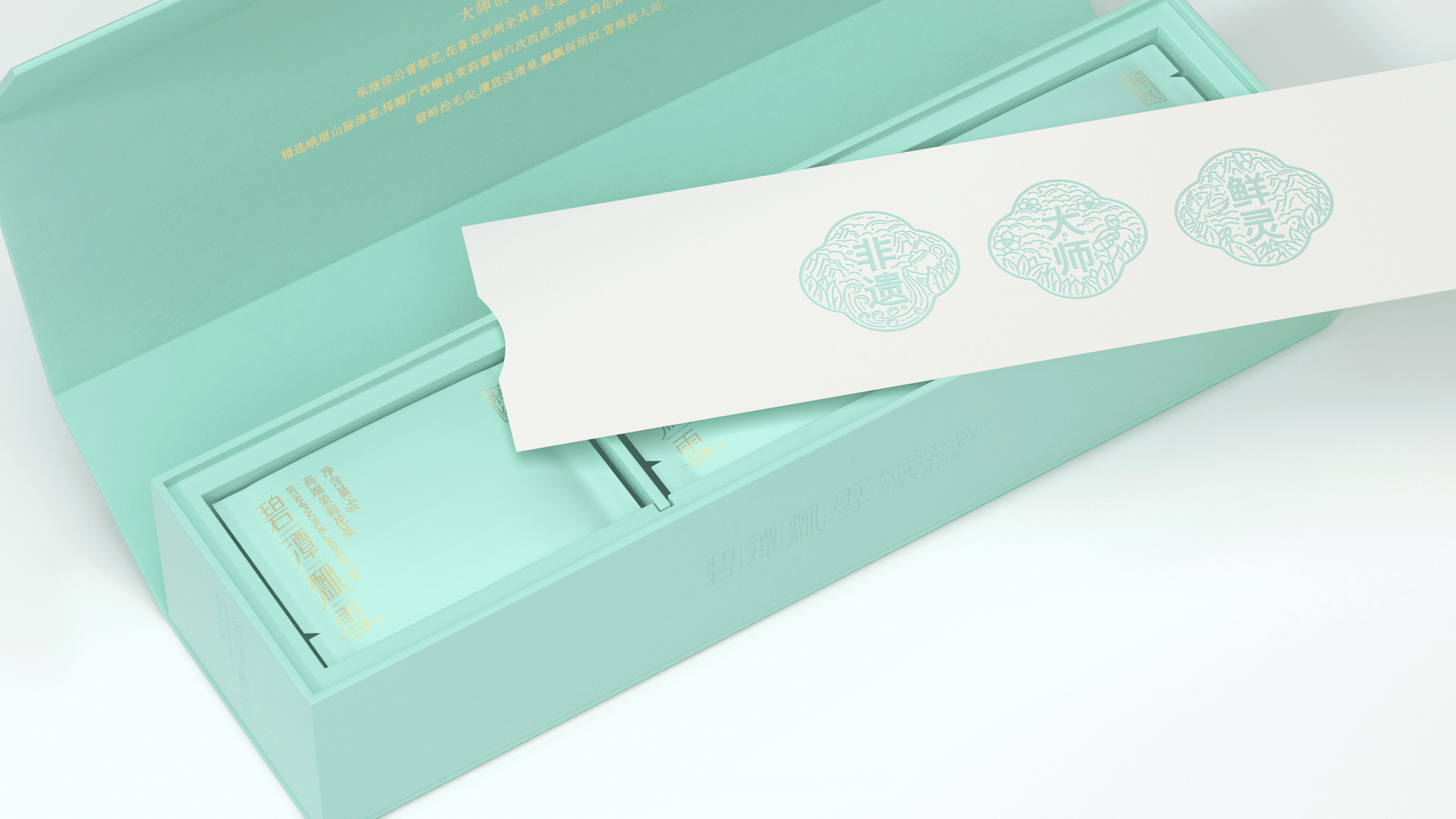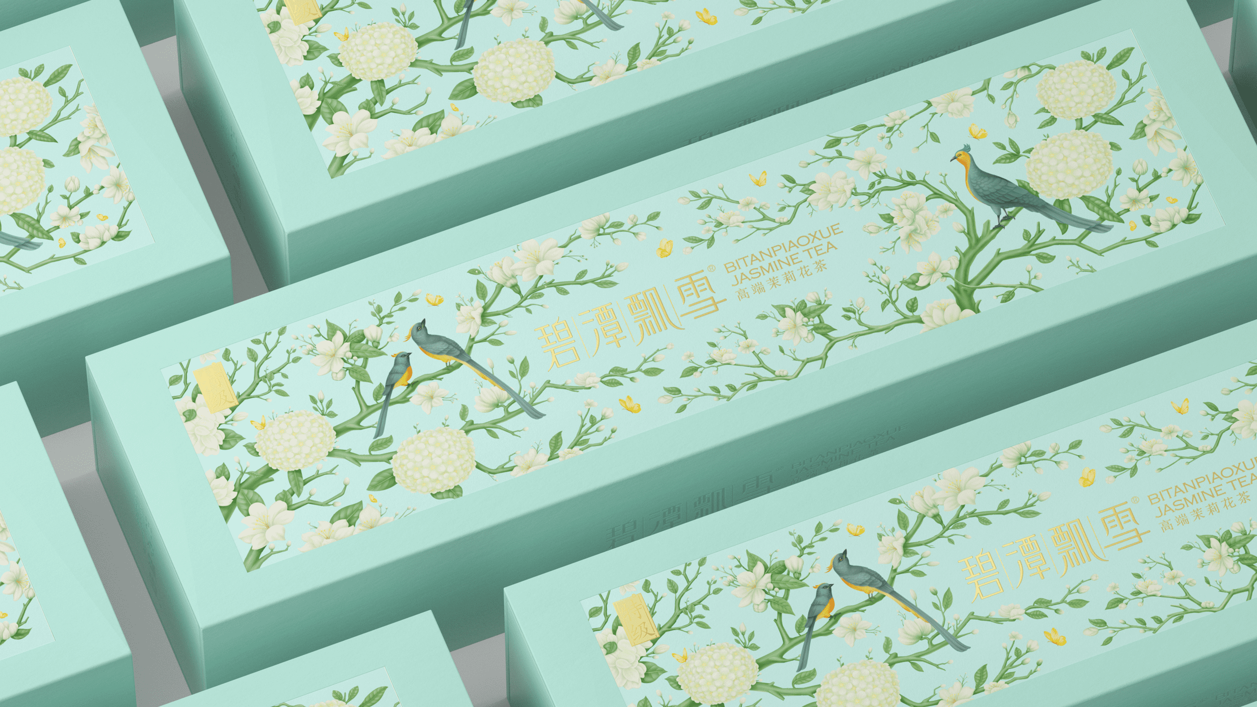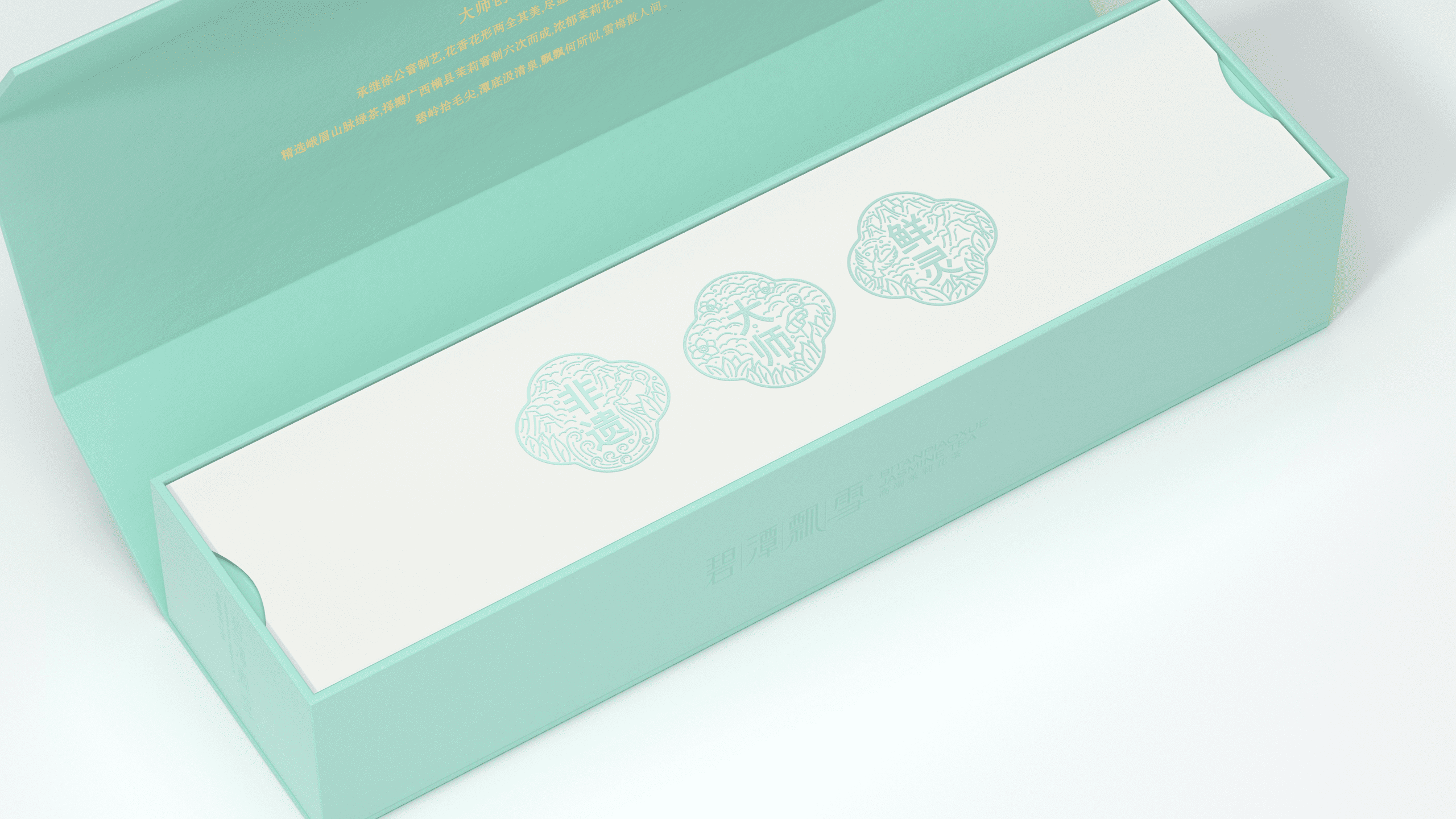 其醇香的口感与风味也让许多年轻群体所喜爱,于是我们尝试打破原有克制的设计语言,转为丰富且细腻的基调来呈现这款产品升级。在保持长条形礼盒的前提下,我们将茶树与茉莉花进行了插画融合,表现在了礼盒正面的贴纸上,点缀以灵动的鸟类,以打破这种纯粹的寂静。在原产品浅调青绿的色调中,更显典雅与生动。