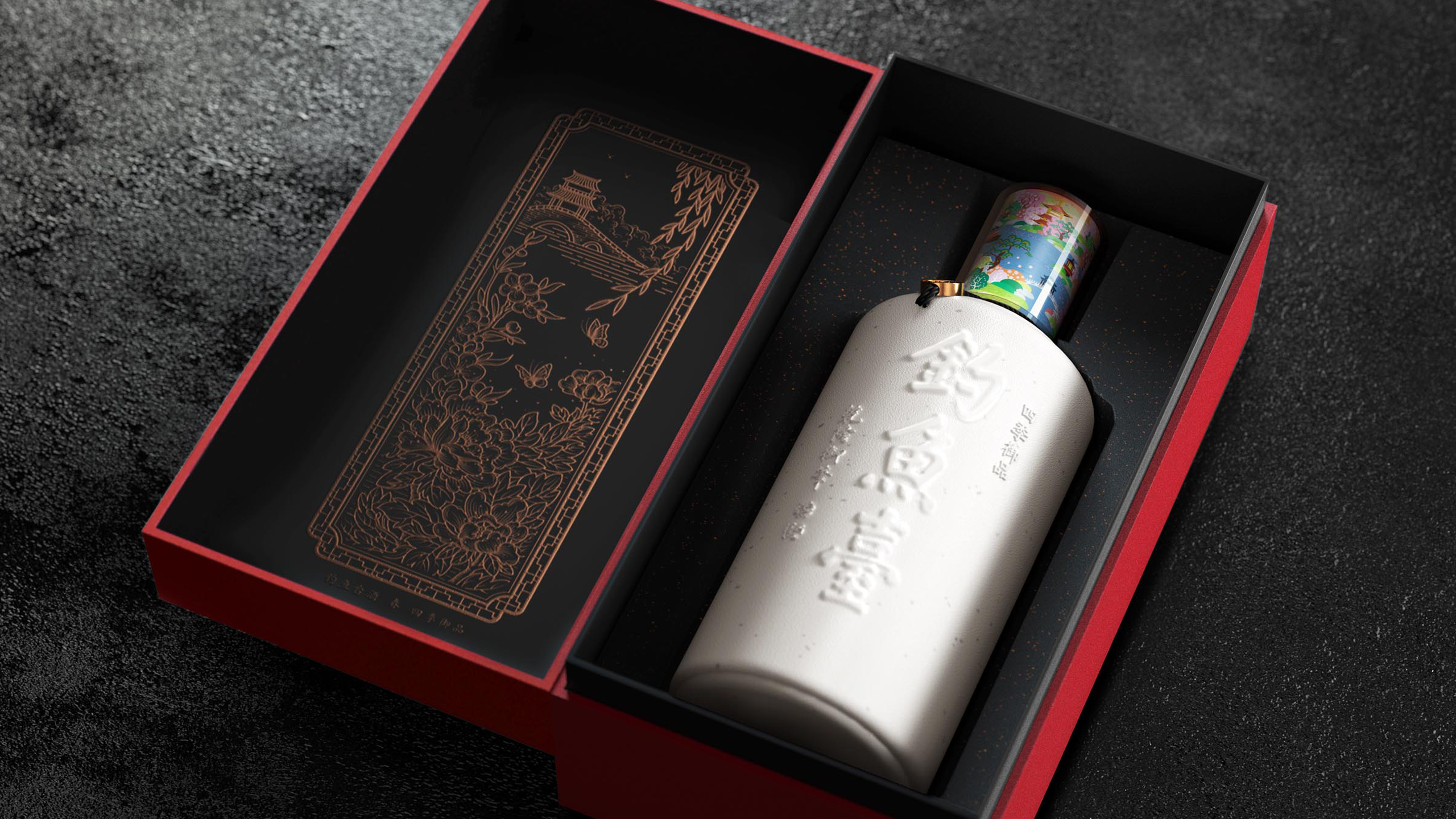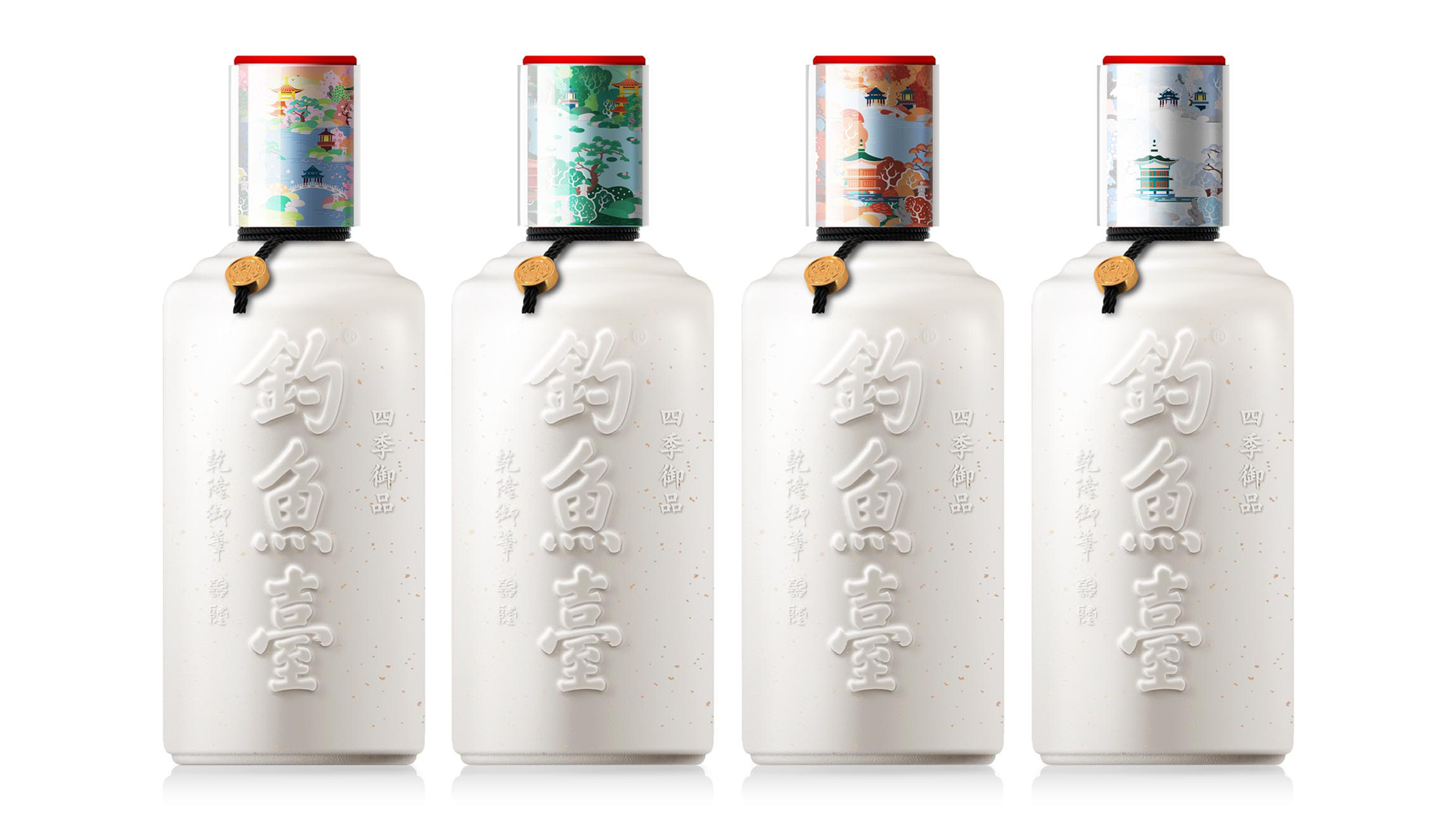 钓鱼台的皇家风格自然是不用多说,属于基因式的存在。我们理所当然的也就将重点放在了四季御品的打造上。结合四季的概念,我们将产品一箱定位四瓶装,而每一瓶的盖子上利用不同的插画内容表现出了不同的季节,这也是基于我们发现购买酒水的用户整箱购买的几率也在逐年升高。一箱打开后有不同的视觉体验,自然也会让消费者对品牌有更好的印象。而无论是瓶盖插画还是包装物上的插画,都不难发现我们对于细节的理解。既然称之为御品,自然是要与皇家的东西挂钩,观者不难发现,其实内容物所表现的就是皇家园林的一部分,这也让这款产品在点名主题的同时,亦做到了自己的个性。要知道当下时代,无个性,不出街。